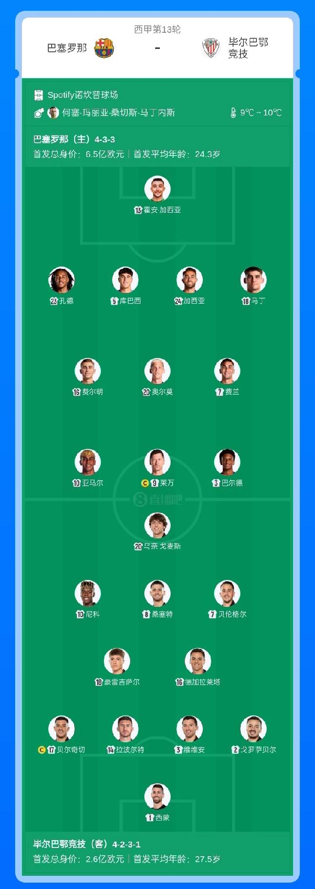 西甲-巴萨vs毕巴首发:亚马尔PK尼科 莱万先发,加西亚复出首发出战!拉菲尼亚替补 11月22日 23点15分,西甲第13轮,巴萨主场迎战毕巴。本场是巴萨时隔2年半重返诺坎普的首场比赛。巴萨方面,加西亚复出,拉什福德缺阵。亚马尔、莱万、费兰先发,拉菲尼亚复出进入替补席