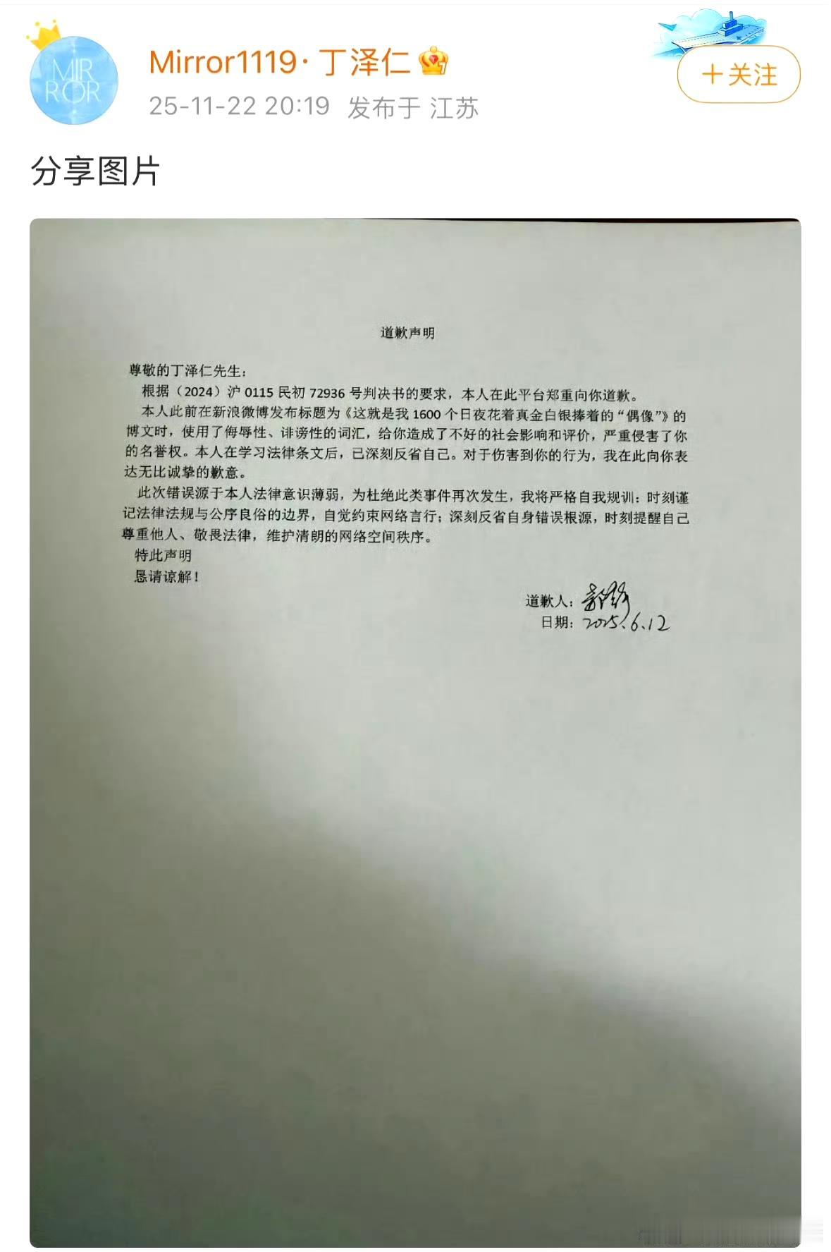 丁泽仁“唯一的姐”发了道歉声明,被丁泽仁告了名誉权赔了5万! 不过这个事情现在挺耐琢磨的,毕竟这个告的是名誉权,而并非是诽谤。 换句话的意思就是之前的内容可能大部分都是真的(“恋爱期间出轨”“私生活混乱”“隐瞒女友身份”“酒店发生性行为”等),现在就是换个说辞,如果是假的,完全可以告一个诽谤罪。 所以丁泽仁也算是凭借这个事出名了,说他的名字可能没人知道,说到这个事,人的第一反应“哦……原来就是他呀!” 不过我估计这个事情肯定还有后续,不可能就这样结束啦。