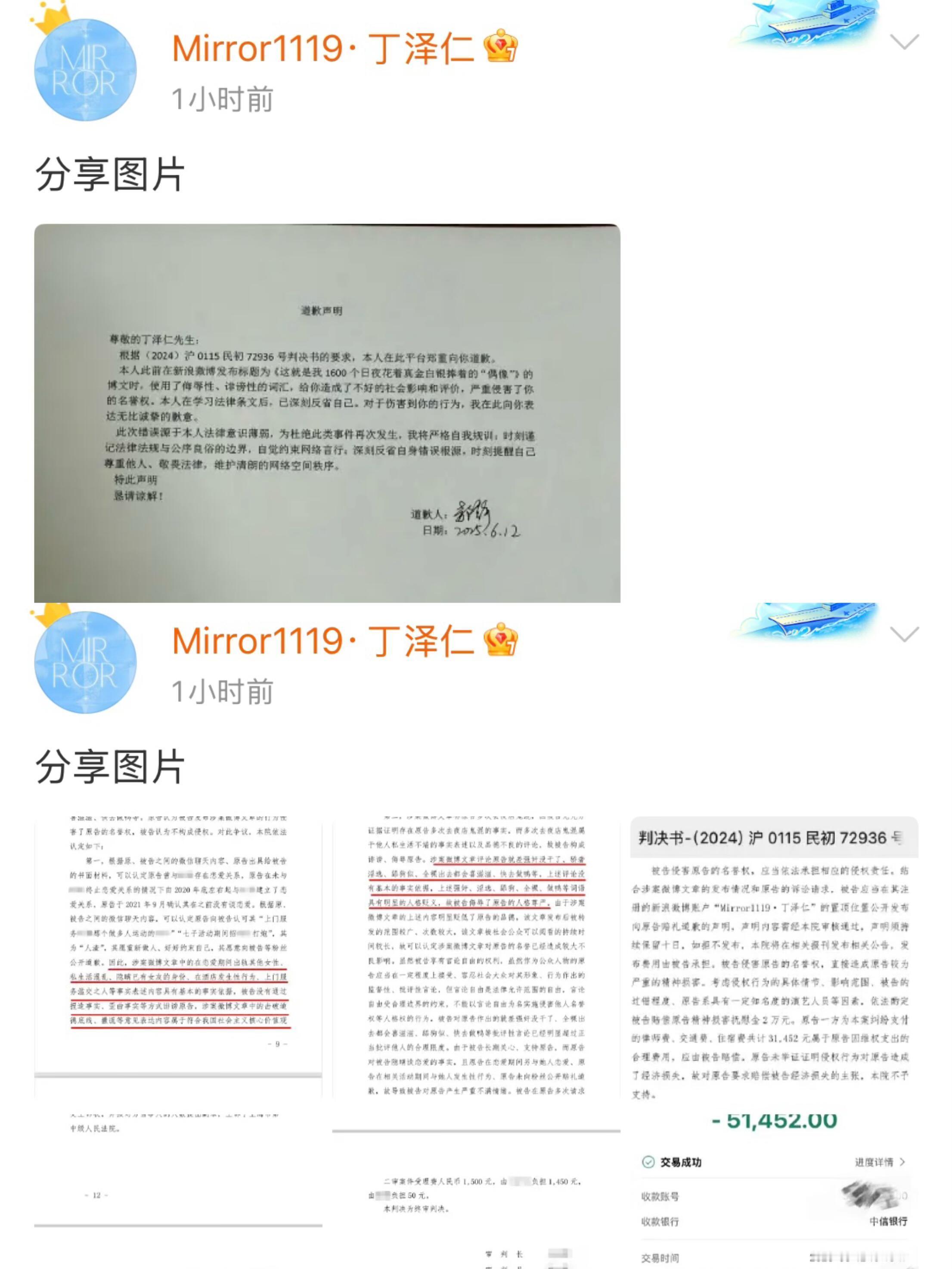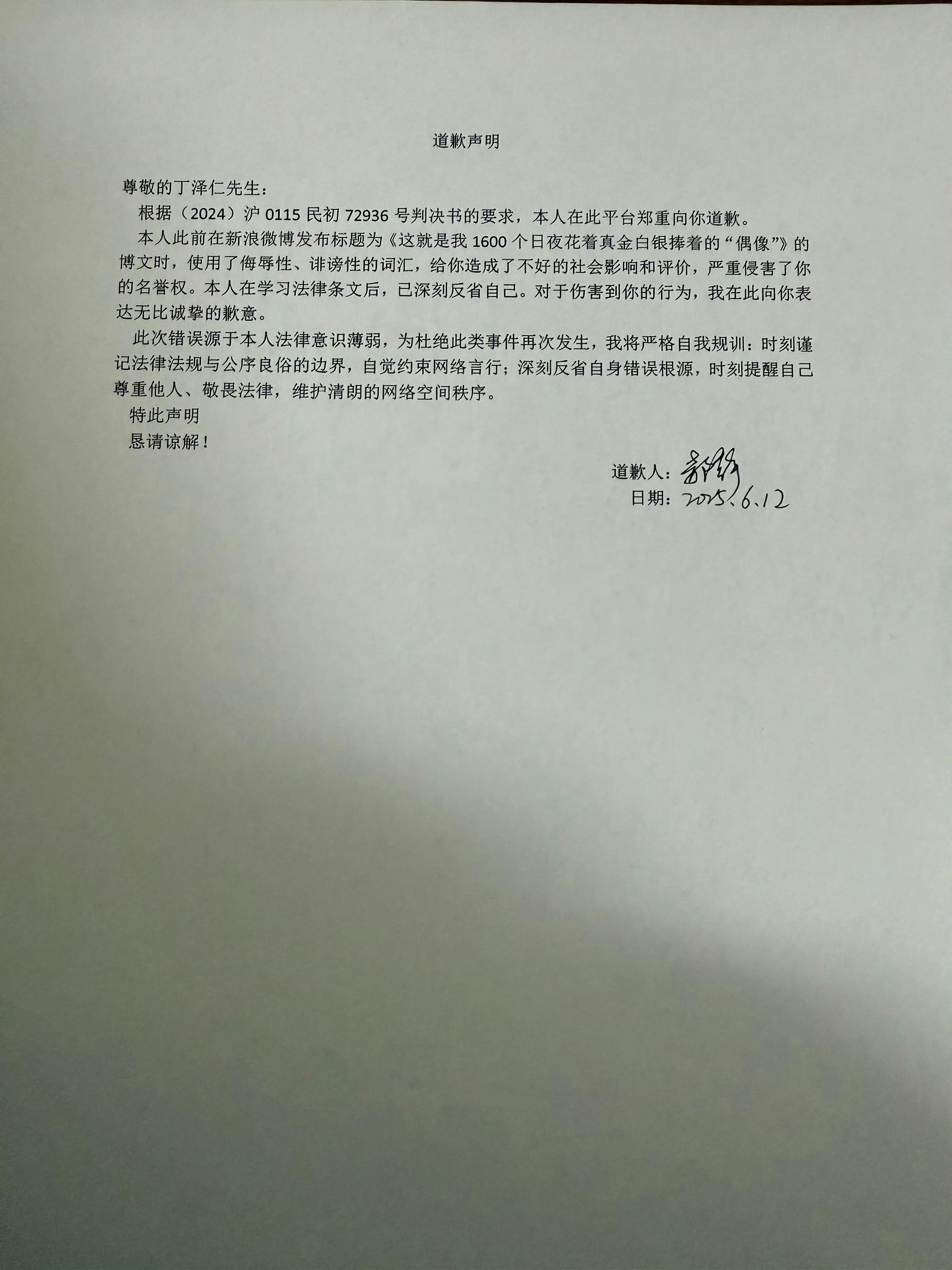 丁泽仁唯一的姐发道歉声明了她被丁泽仁告了名誉权,赔了5万