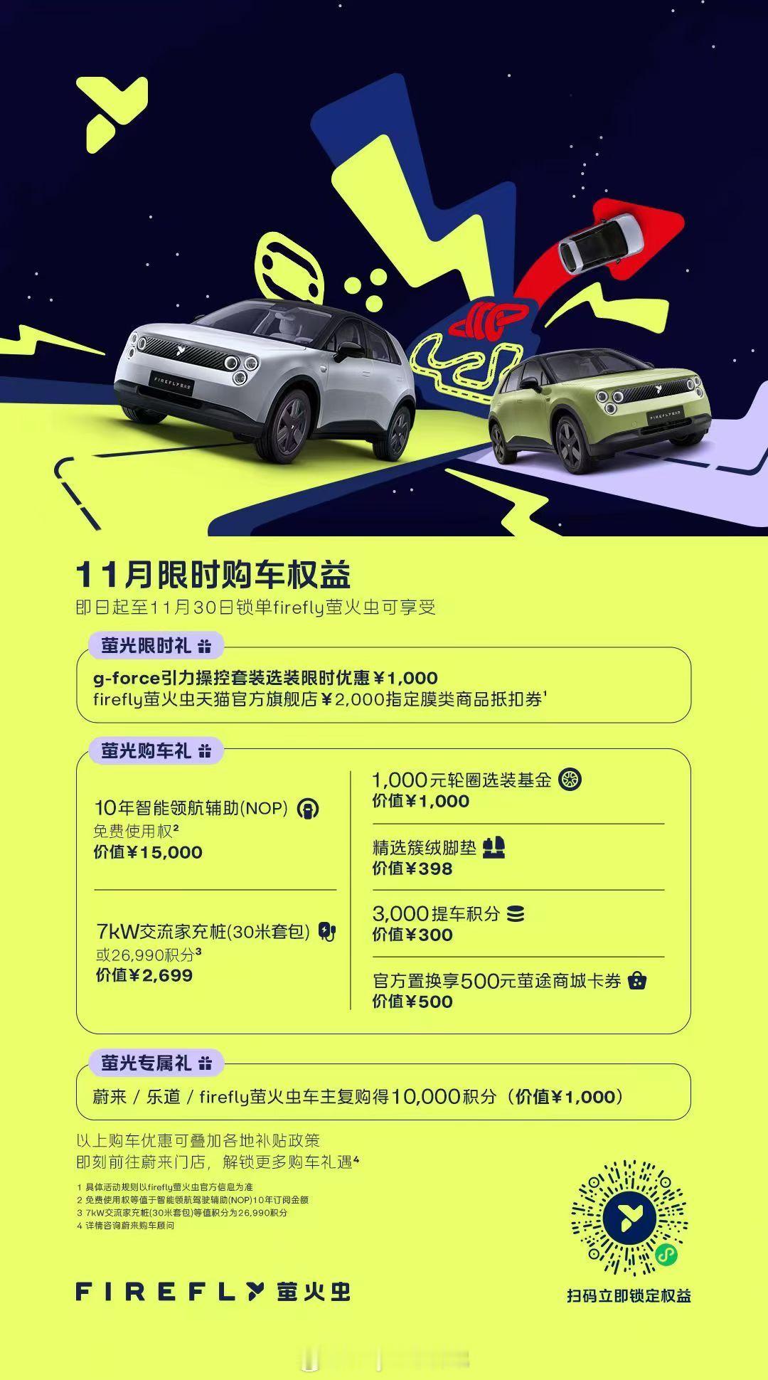 昨天在广州车展刚分享了几款改装车,今天看到官方推出官改套装!萤火虫本身的操控就很好,现在这套官方g-force引力操控套装可以让你的小虫子操控感再提升!这套g-force引力操控套装应该就是上次推出夜行动物版本时一起展示过的,不管新老车主都能拥有!新车主2999的价格就能选配,老车主目前也可以2999价格拥有!这个价格是今年12月31日前才享有!超过时间恢复原价3999和4599。想给爱车升级一下的朋友可以尽管冲!