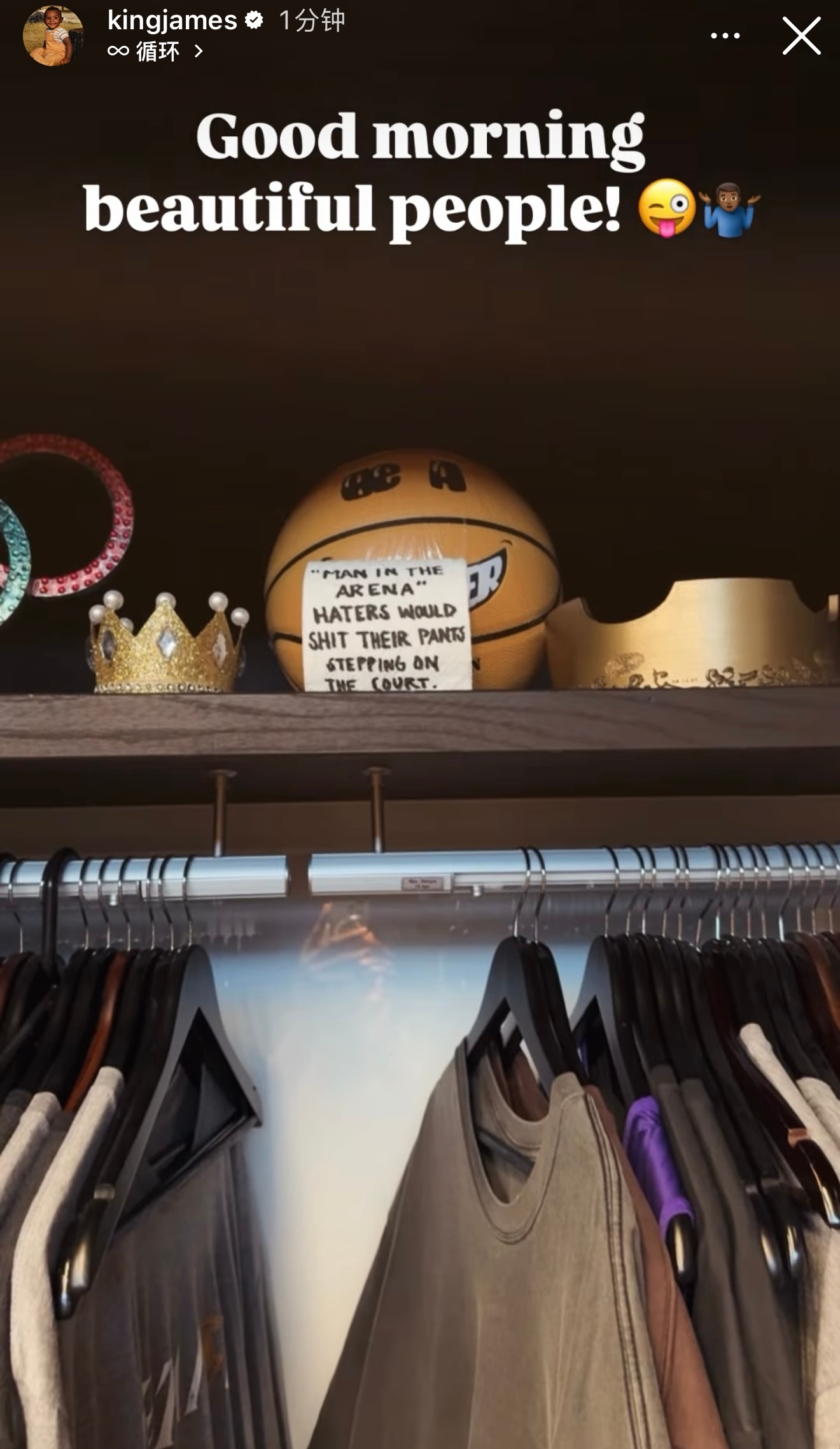 詹姆斯刚刚更新社媒:“早呀!美丽的朋友们!”中间有个纸条写着:“竞技场的男人,黑子们要是敢踏上球场,准会吓得屁滚尿流。”