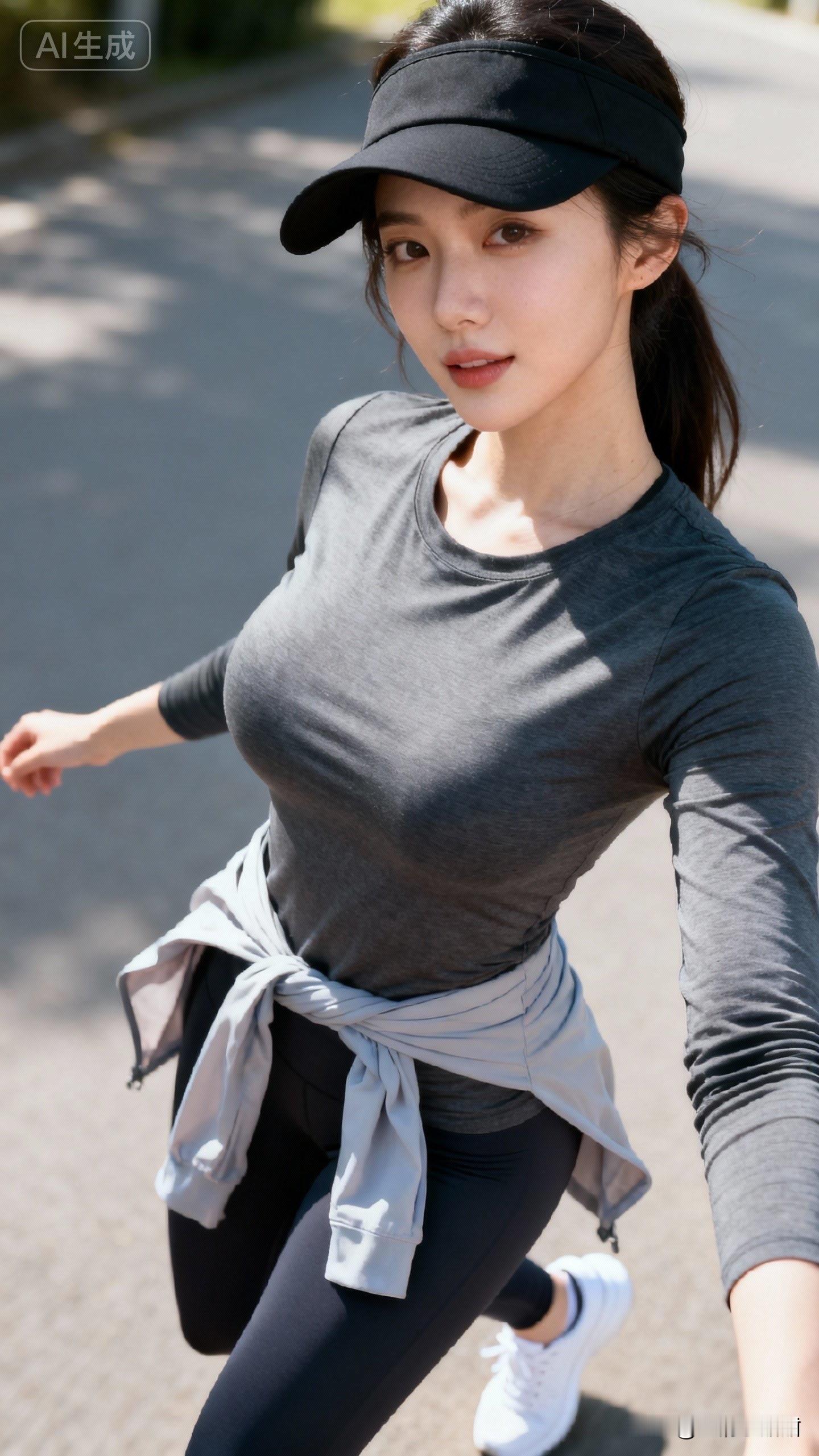 她这身是当下流行的“简约运动风”穿搭:灰黑拼色长袖运动上衣,修身版型适配户外场景;搭配深灰紧身运动裤,浅灰防晒衣系腰增加层次感;再配黑色空顶帽,是现在很火的“轻运动日常”思路,适配晨跑、公园散步等场景,舒适又显利落活力。
