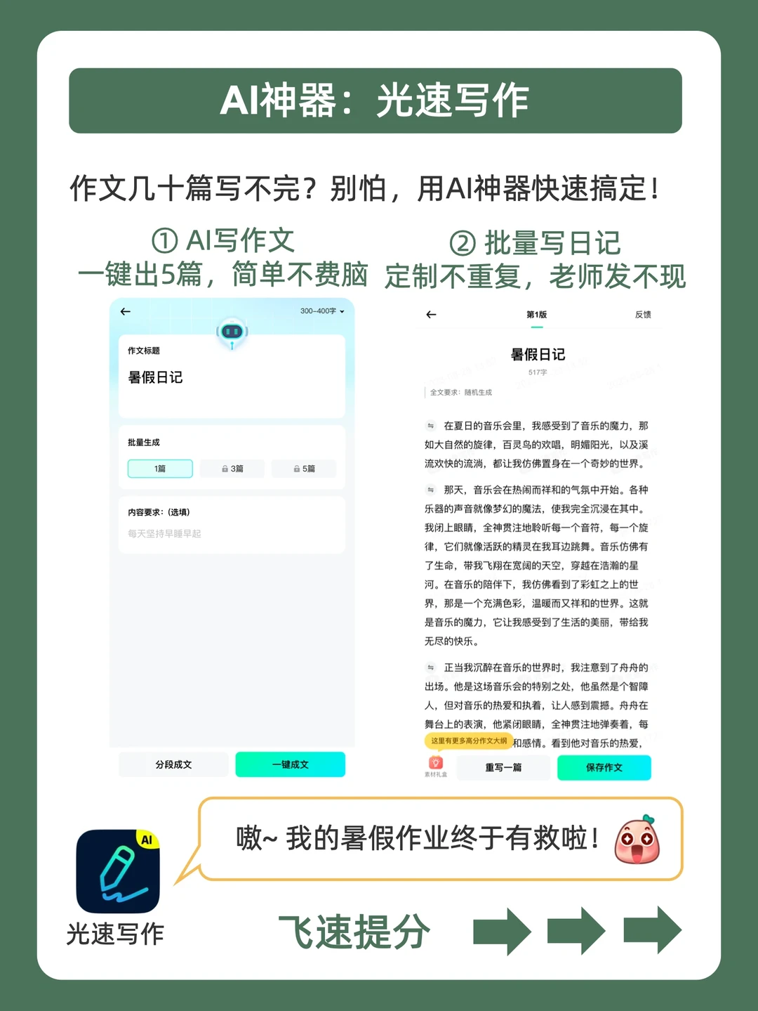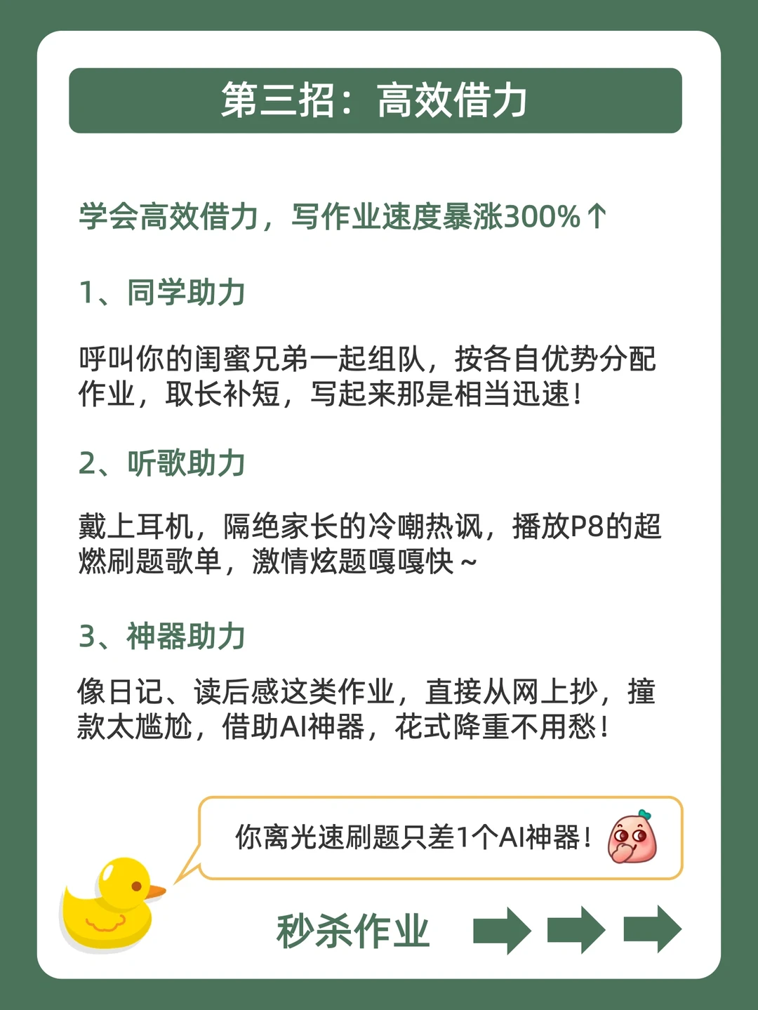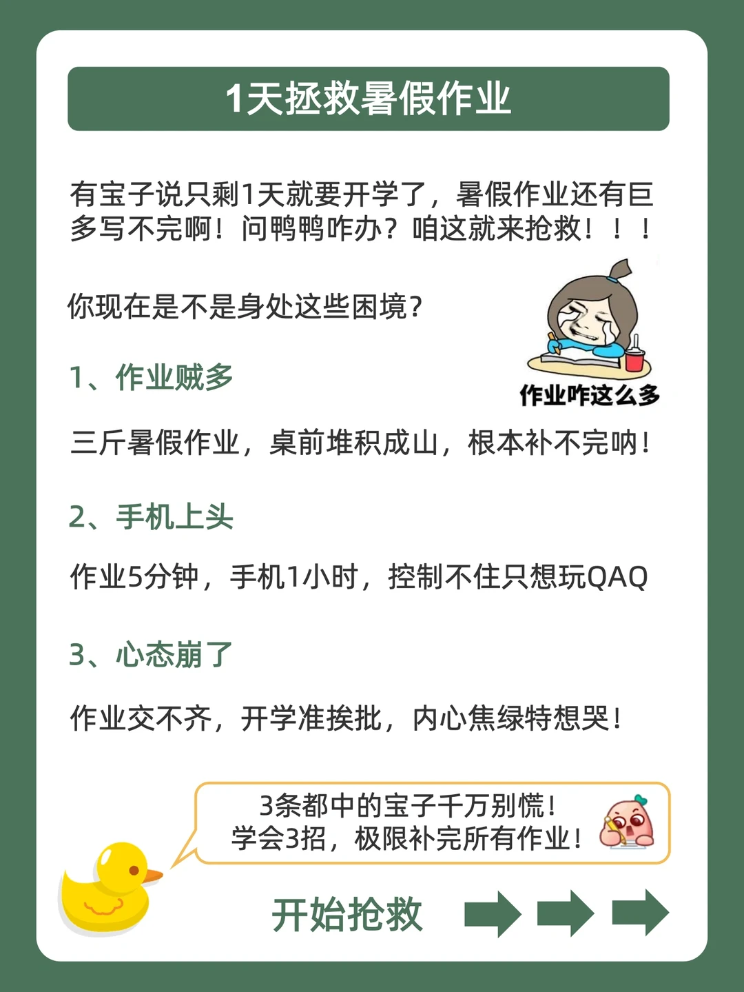 . [赞R]作业摆烂不用怕,鸭鸭带你做学霸❗ . [向右R]好多宝子说暑假作业拖到最后一晚还没没没写完![哭惹R] . [飞吻R]向鸭鸭求救,有没有啥方法可以快速补完所有作业![赞R] . 今天就来分享,1天拯救暑假作业,搭配光速炫作业神器:光速写作!从此补完作业,开学无忧![赞R] . ️🐣我是鸭鸭,持续更新优质学习方法,陪宝子们逆袭学霸,驰骋学海!🌊