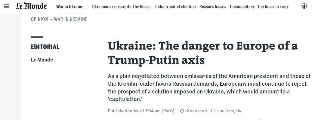 《世界报》提出了“特朗普-普京轴心”这一新概念,并撰文指出这对欧洲构成威胁。 热点观点海外新鲜事