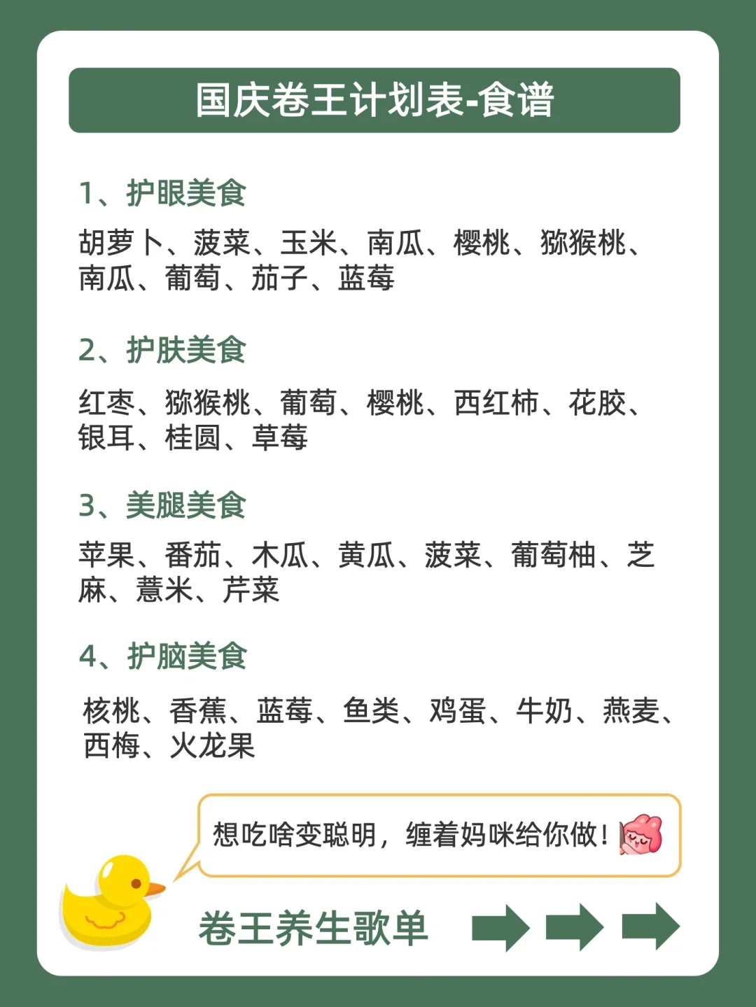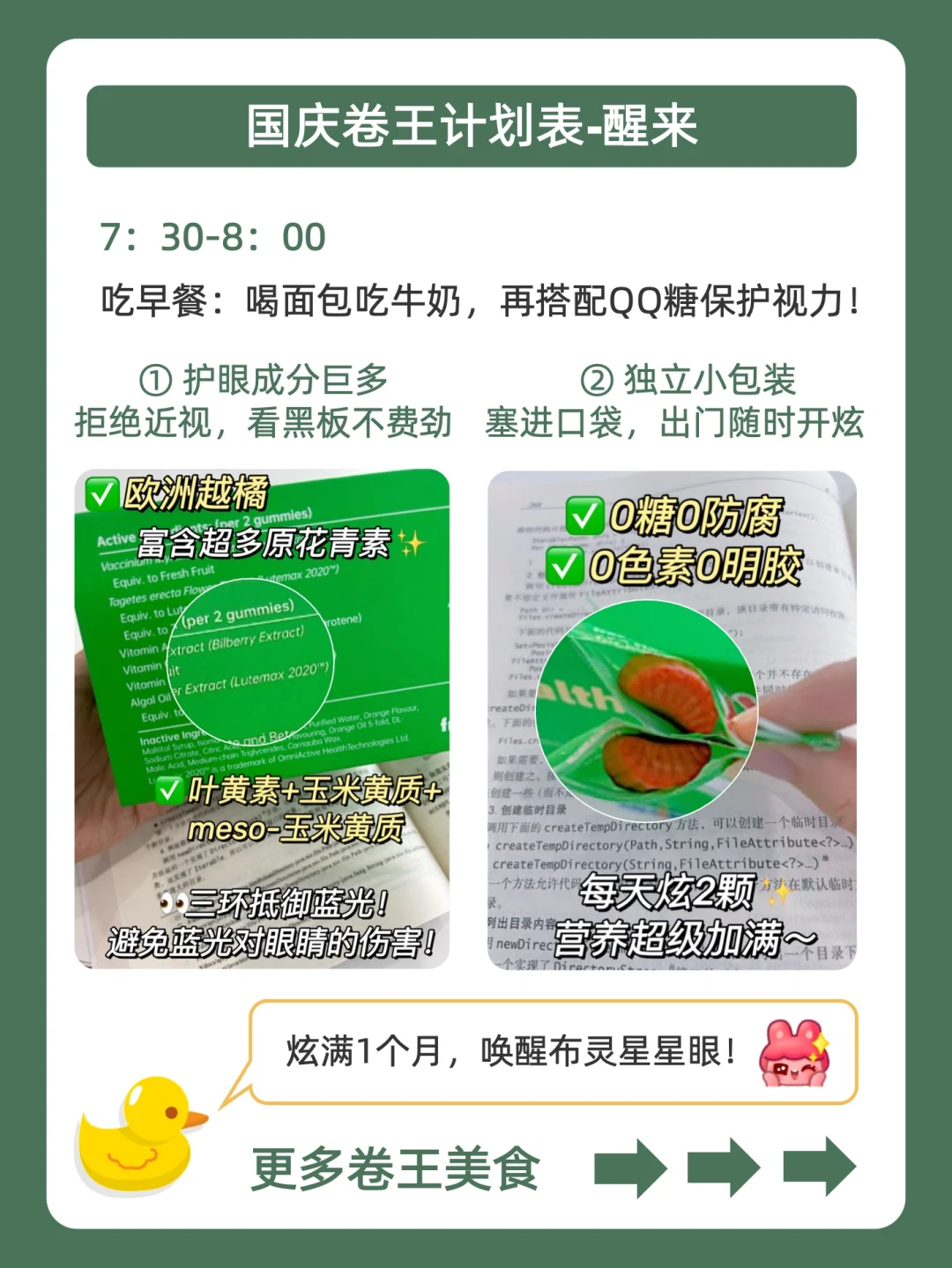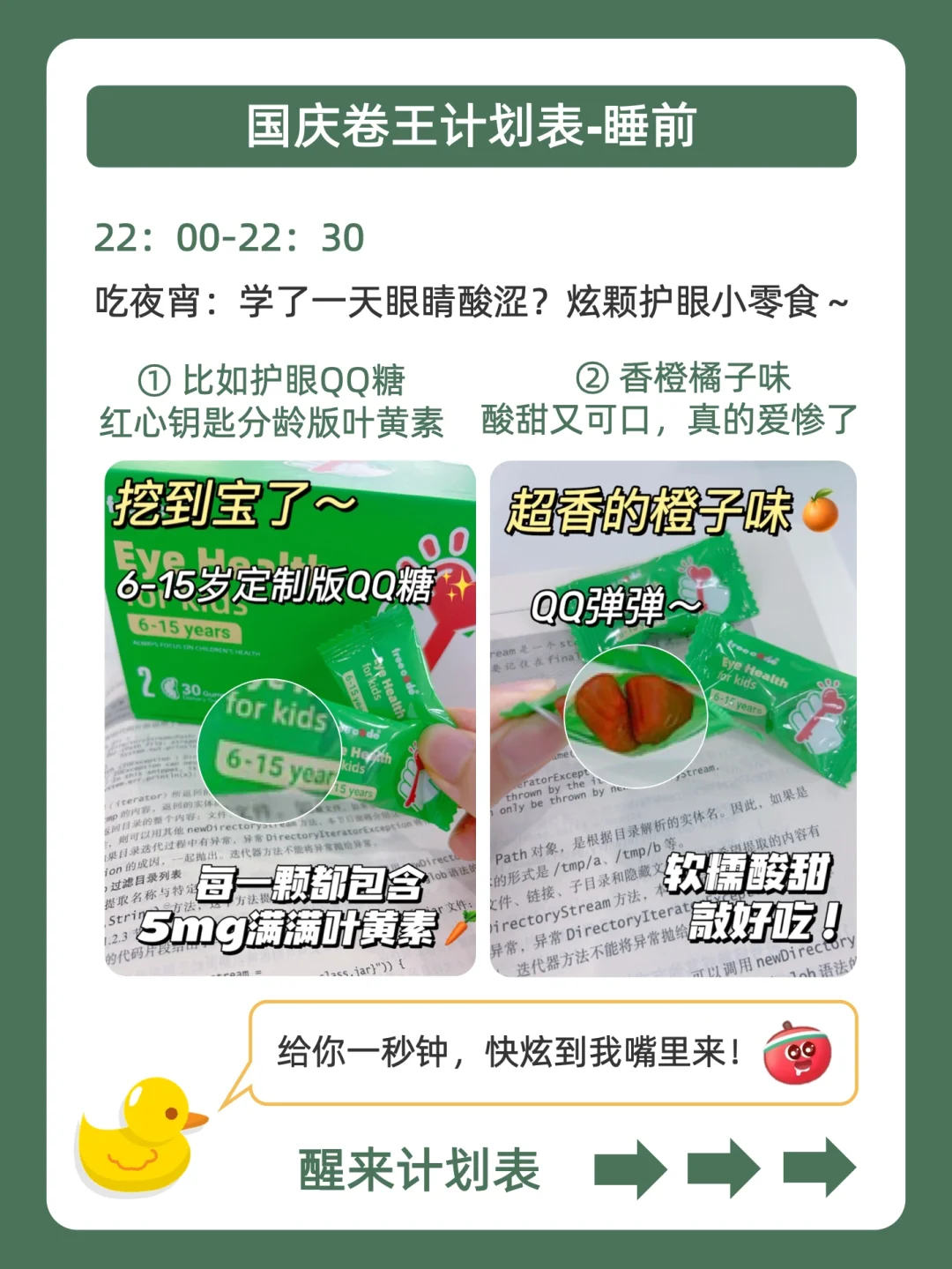 . [赞R]学习摆烂不用怕,鸭鸭带你做学霸❗ . [向右R]好多同学说马上到中秋国庆了,想在8天假期狠狠卷一把,但不知道咋做?[石化R] . [飞吻R]鸭鸭这么宠粉,肯定会偷偷告诉你高效内卷的秘密![偷笑R] . 今天就来分享,国庆限定版卷王计划表,搭配护眼QQ糖红心钥匙分龄叶黄素,从此学嗨玩爽,开学逆袭![赞R] . ️🐣我是鸭鸭,持续更新优质学习方法,陪宝子们快乐逆袭,驰骋学海!🌊