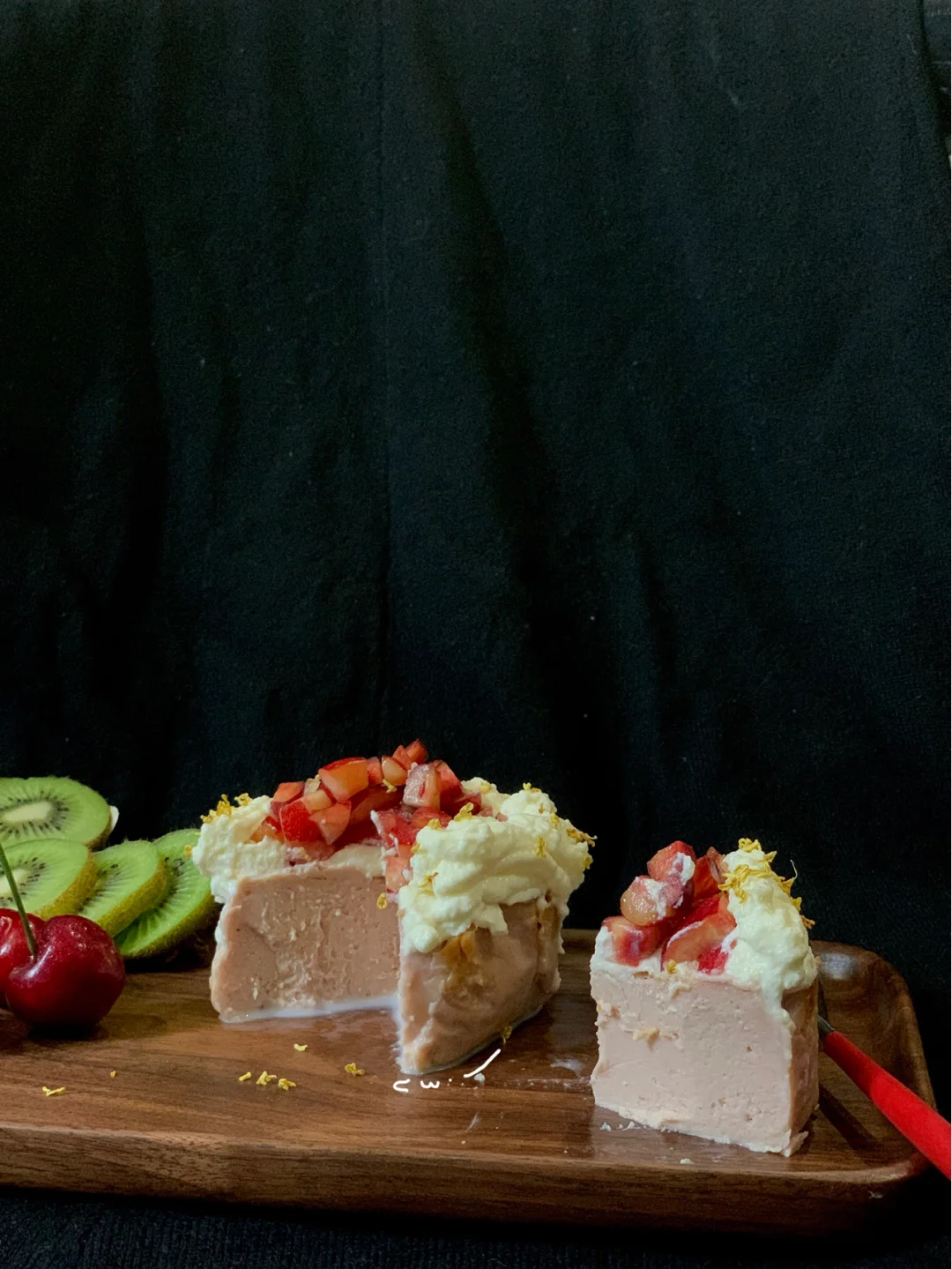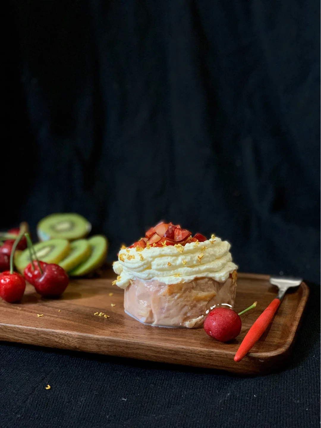 冰箱冰一夜,第二天涂上奶油,放上樱桃装饰~