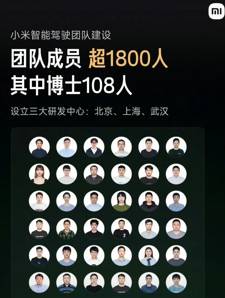 从雷军晒出来的小米辅助驾驶团队来看,智驾团队成员超过了1800人,其中,博士108人,并且,还在北京、上海和武汉设立了研发中心。