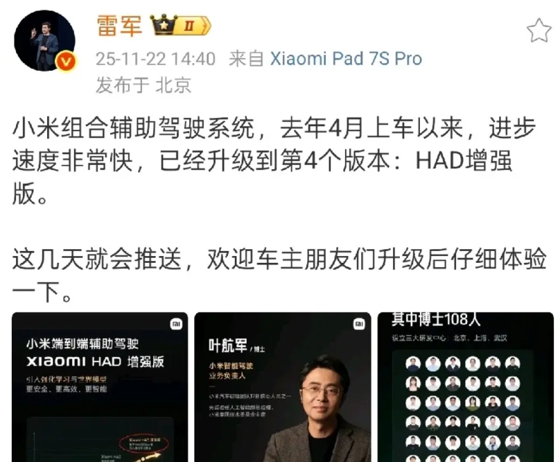 雷军:小米辅助驾驶进步非常快,从去年到现在已经迭代了4个大版本更新。