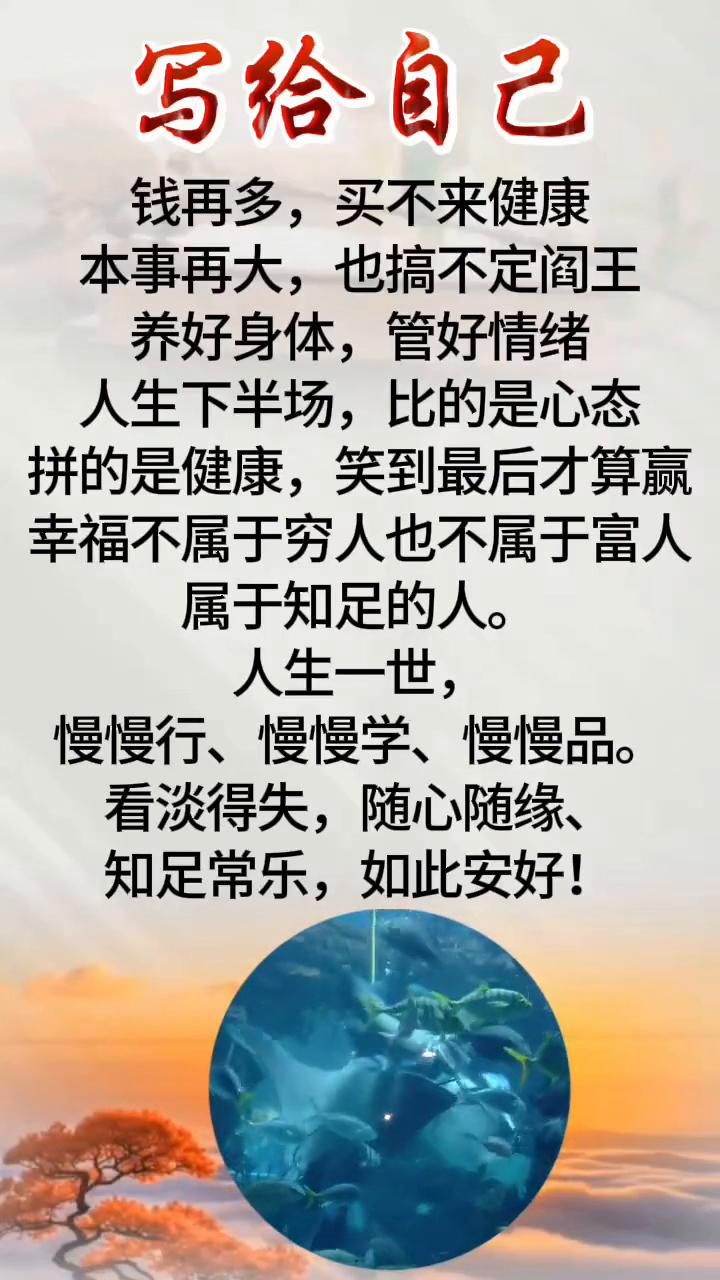 写给自己。 钱再多,买不来健康;本事再大,也搞不定阎王。养好身体,管好情绪。人生下半场,比的是心态,拼的是健康,笑到最后才算赢。幸福不属于穷人也不属于富人,属于知足的人。人生一世,慢慢行、慢慢学、慢慢品。看淡得失,随心随缘、知足常乐,如此安好!