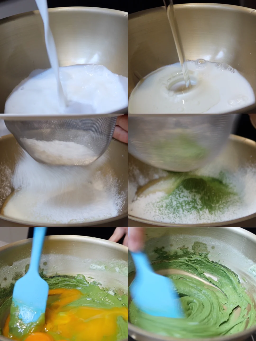 1.面粉➕抹茶粉➕四个蛋黄➕油➕牛奶全部搅拌均匀。放一边等着用