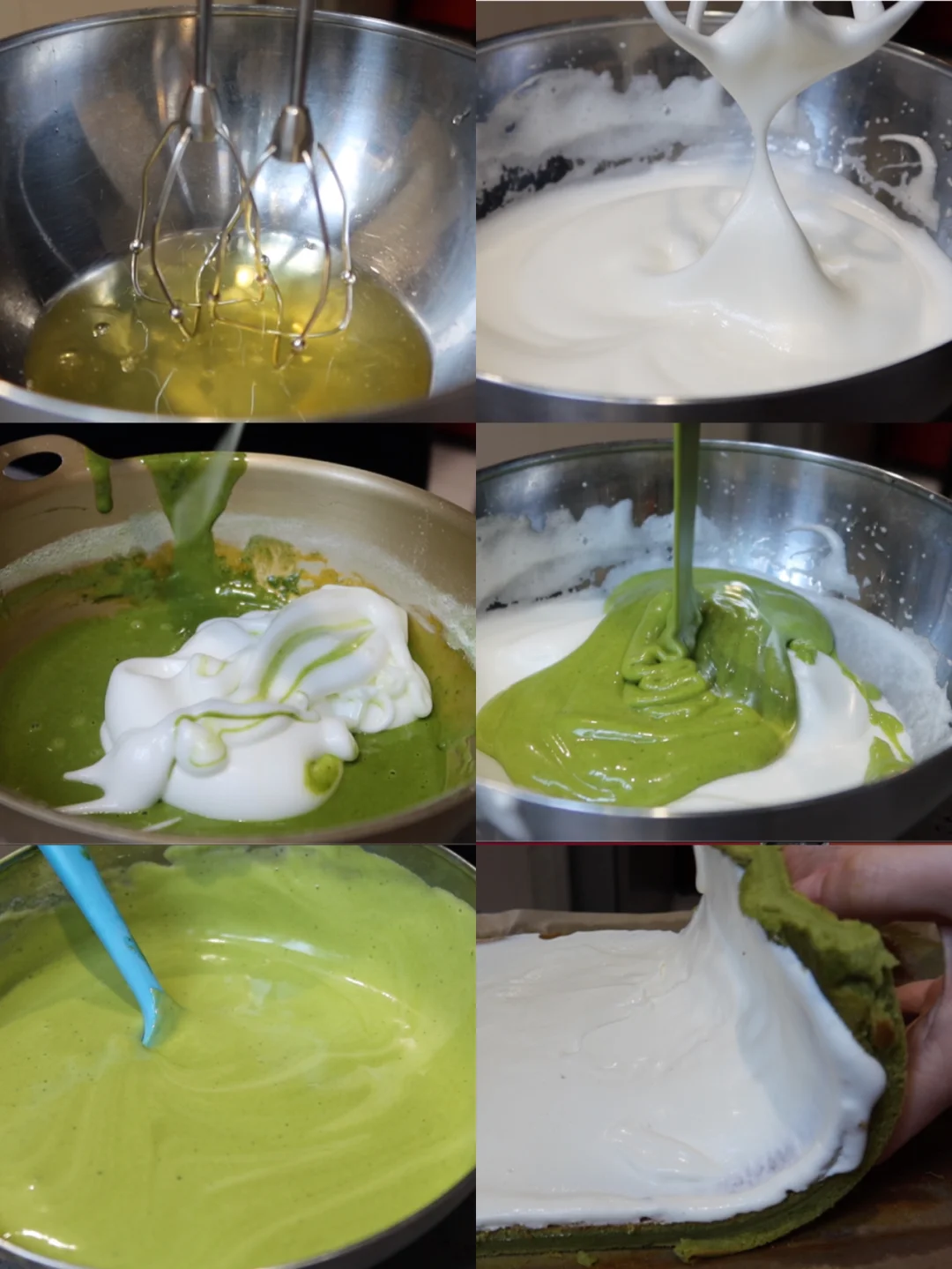 3.1/3蛋白加入抹茶糊糊里切拌均匀。完事,拌好的全部倒入剩下的蛋白糊里,切拌均匀。