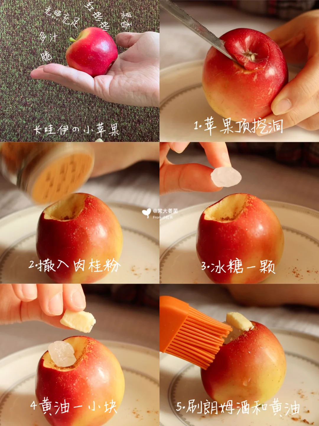 1.苹果中间掏空,依次:塞进糖、葡萄干、坚果、肉桂、黄油块。