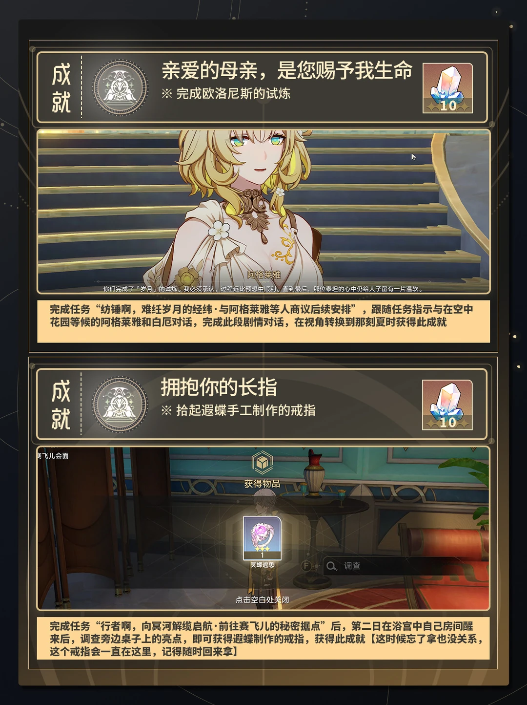 完成任务“纺锤啊,难纴岁月的经纬·与阿格莱雅等人商议后续安排”,跟随任务指示与在空中花园等候的阿格菜雅和白厄对话,完成此段剧情对话,在视角转换到那刻夏时获得此成就