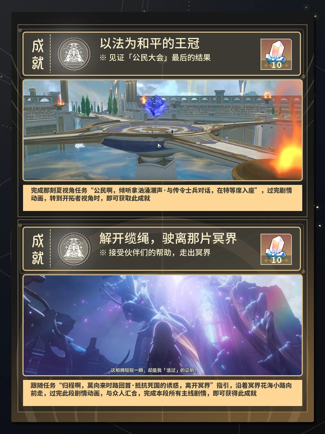 完成那刻夏视角任务“公民啊,倾听拿汹涌潮声·与传令士兵对话,在特等席入座”,过完剧情动画,转到开拓者视角时,即可获取此成就