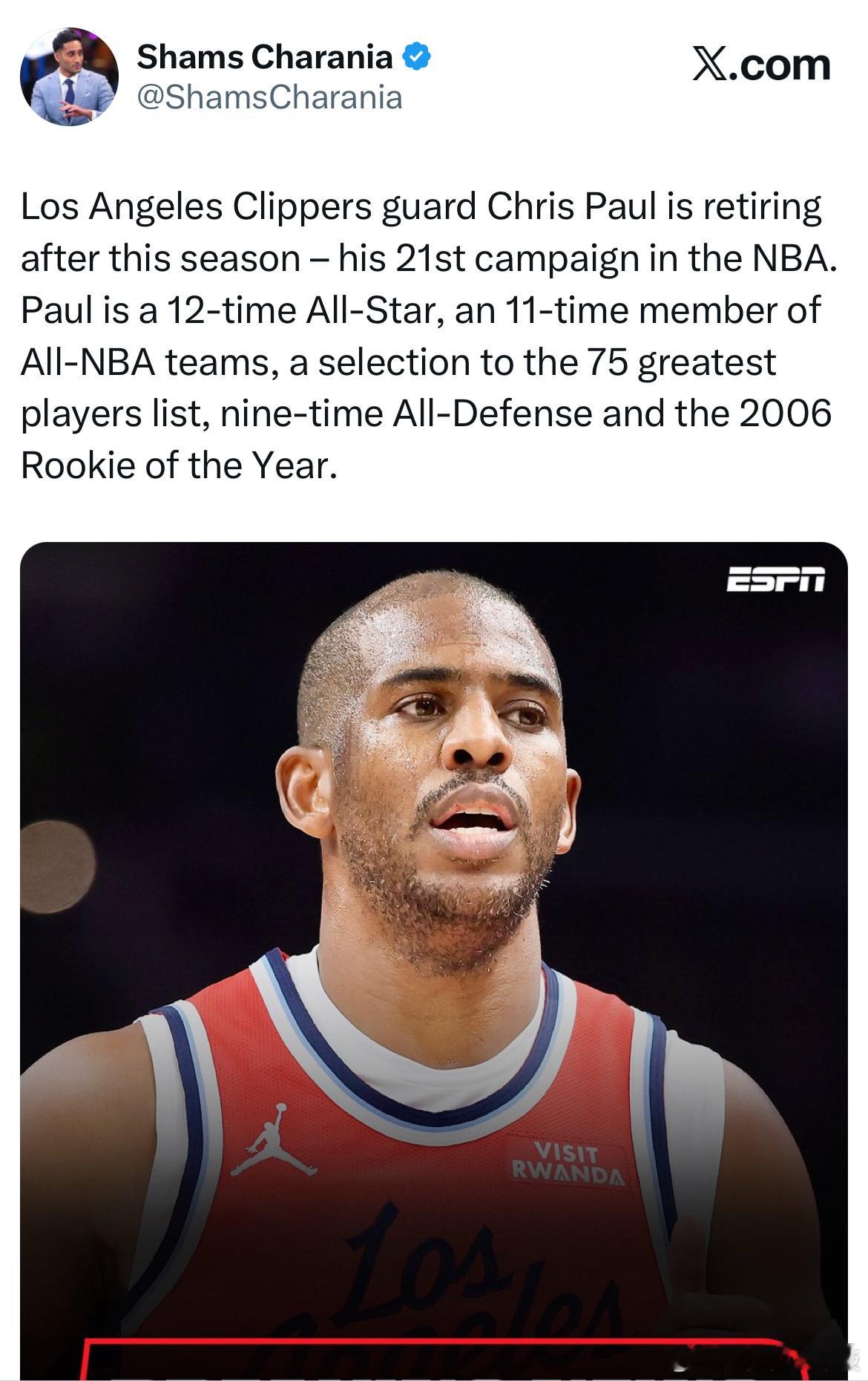 Shams:保罗将在本赛季结束后退役!!本赛季是他征战NBA的第21个赛季,保罗曾12次入选全明星,11次入选NBA最佳阵容,入选NBA历史75大球星,9次入选最佳防守阵容,以及2006年NBA最佳新秀。