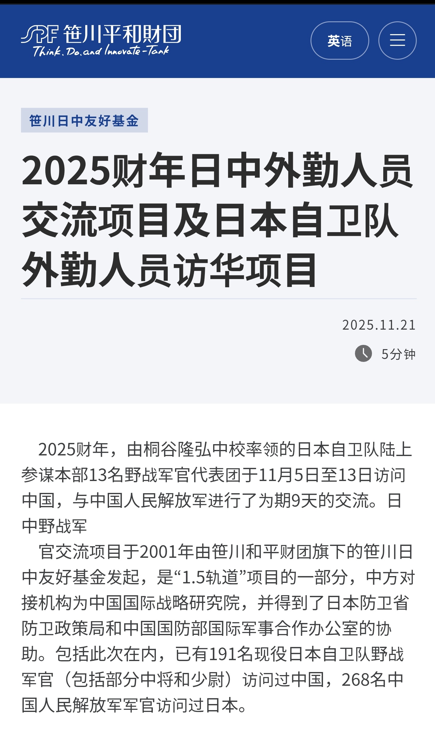 2025年度日中佐官级交流项目,实施自卫队佐官级访华计划在 2025 年度中,由日本陆上幕僚监部的一等陆佐桐谷高弘担任团长的 13 人日本自卫队佐官级访华团,于 11 月 5 日至 13 日为期 9 天访问中国,并与中国人民解放军开展交流。日中佐官级交流项目是由民间团体“笹川平和财团·笹川日中友好基金”作为“1.5 轨道”(Track 1.5)的交流项目,由中国国际战略学会作为中方合作机构,并在日本防卫省防卫政策局以及中国国防部国际军事合作办公室的协助下,于 2001 年启动实施的。包括本次在内,至今已实现现役自卫队佐官(部分包括将补与尉官级)191 人访华,以及中国人民解放军军官 268 人访日。日本自卫队佐官级访华团于 11 月 5 日开始访问,当日下午访问了隶属中央军事委员会的军事科学院,并对军事科学院副院长姚党鼐中将进行了礼节性拜会。次日 6 日,代表团参观了位于北京市郊外的陆军警备第 3 师,下午则在中国人民大学与国际关系学院的教师与研究生举行座谈交流。11 月 7 日至 9 日期间,代表团访问了山西省大同市,参观了世界文化遗产——北魏时期的云冈石窟及当地博物馆,随后前往湖北省武汉市并参观市内的历史遗迹。11 月 10 日,代表团访问了武汉市的中部战区空军航空兵第 38 团,在听取部队介绍与进行问答交流后,参观了中国国产的大型运输机 运-20A。11 月 11 日至 12 日期间,代表团访问了广东省湛江市的南部战区海军湛江基地,进行了对基地副政治委员(少将)的礼节性拜会,并登上导弹护卫舰“玉林舰”进行参观。此外还前往雷州半岛的足荣村,考察当地乡村振兴的实际情况并进行交流。通过对各地陆海空军事设施的参观、与相关人员的意见交流,以及对中国教育机构与历史文化遗迹的访问,此行不仅加深了对中国军队的理解,也促进了对中国社会、历史与文化的全面认识。笹川日中友好基金表示,今后仍将继续推进日中佐官级交流项目,包括邀请中国人民解放军佐官级代表团访日,以及组织日本自卫队佐官级访华活动,为维护两国在安全保障领域中坚力量的交流渠道而努力。