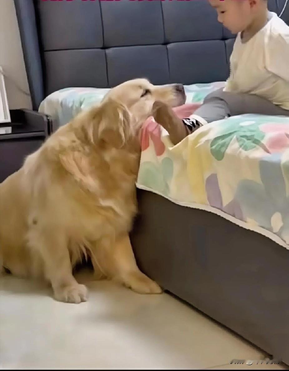 小孩每次要下床时,乖巧懂事的金毛总会趴在床沿,充当脚垫子,生怕小主人不慎跌落。狗狗对主人的爱,都体现在每一处细节里。金毛互动 金毛对主人的爱