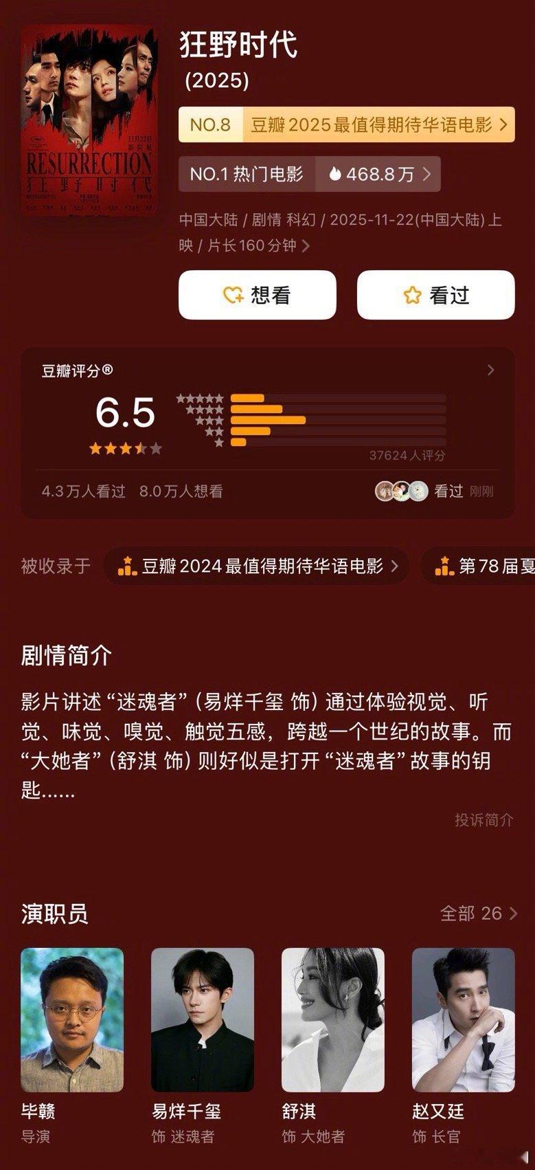 易烊千玺主演的电影狂野时代豆瓣开分6.5,高了低了~