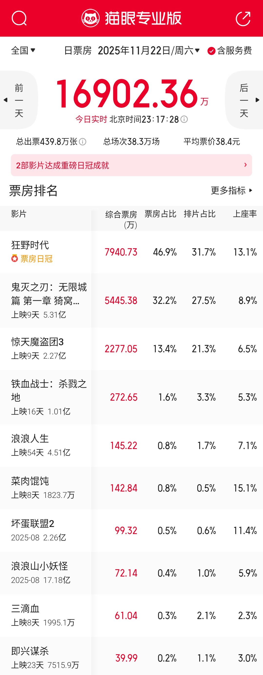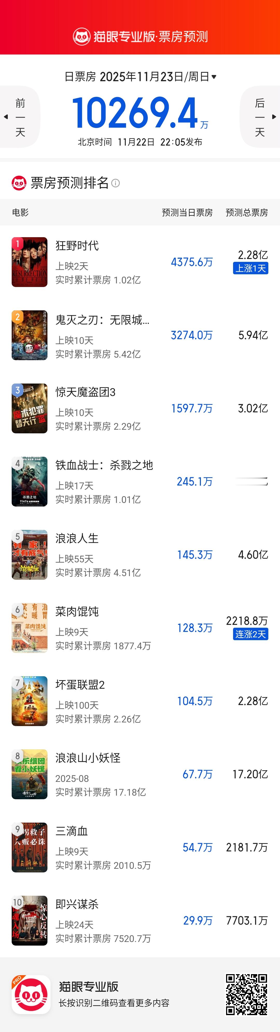 《狂野时代》和《鬼灭之刃》两部今天票房都超预测值,上映首日近8000万很厉害了。