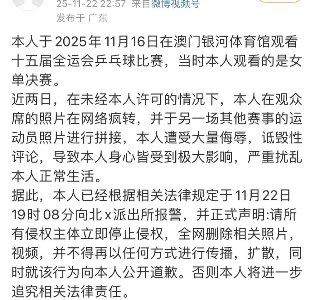 孙颖莎粉丝16号看的比赛,被恶意拼接到19号女团决赛河北队对山东队比赛中,遭受大量外貌、身材、人品等恶意网暴,现已报警