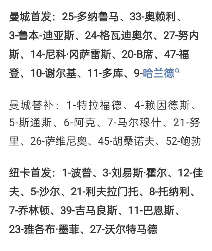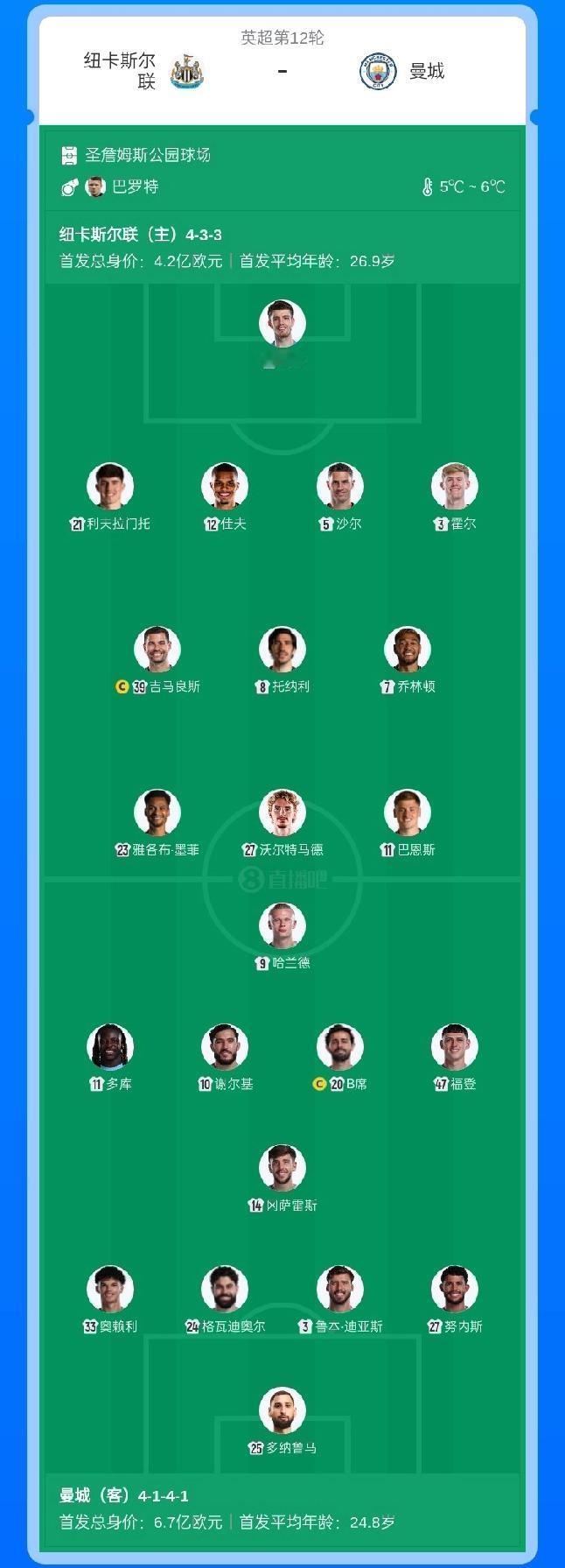 英超-曼城vs纽卡首发:哈兰德PK沃尔特马德!B席、多库、福登先发,赖因德斯、马尔穆什替补 11月23日 英超第12轮,纽卡主场迎战曼城。赛前首发出炉,曼城方面:尼科·冈萨雷斯、B席、福登、谢尔基、多库、哈兰德悉数首发,赖因德斯、马尔穆什、萨维尼奥替补待命。纽卡方面,托纳利、吉马良斯、沃尔特马德悉数首发,伊兰加、拉姆塞替补待命