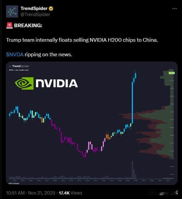 重磅消息:川普团队内部正在讨论向中国出售 NVIDIA H200芯片的方案。受此消息影响,英伟达股价大涨,并带动了整个股市强力反弹! 就在几周前,英伟达($NVDA)创始人黄仁勋还亲口说过:“我们已经 100% 退出中国市场。从 95% 的市占率变成 0%。”而在 8月,英伟达明确表示,他们的财测完全没有假设 H20会对中国出货,更别说 H200了。“ 换句话说:市场几乎已经彻底把英伟达对中国的 AI芯片销售从估值中剔除。在本周的财报电话会上,英伟达的CFO也再次强调:对公司而言,能够对中国销售芯片具有“至关重要”的意义。 所以,即使只是部分恢复对中国的出货,都将是轰动性的消息。 英伟达的季报没有托起美国股市,那么,它将被恢复销售芯片给中国,会重新托起美国股市吗?