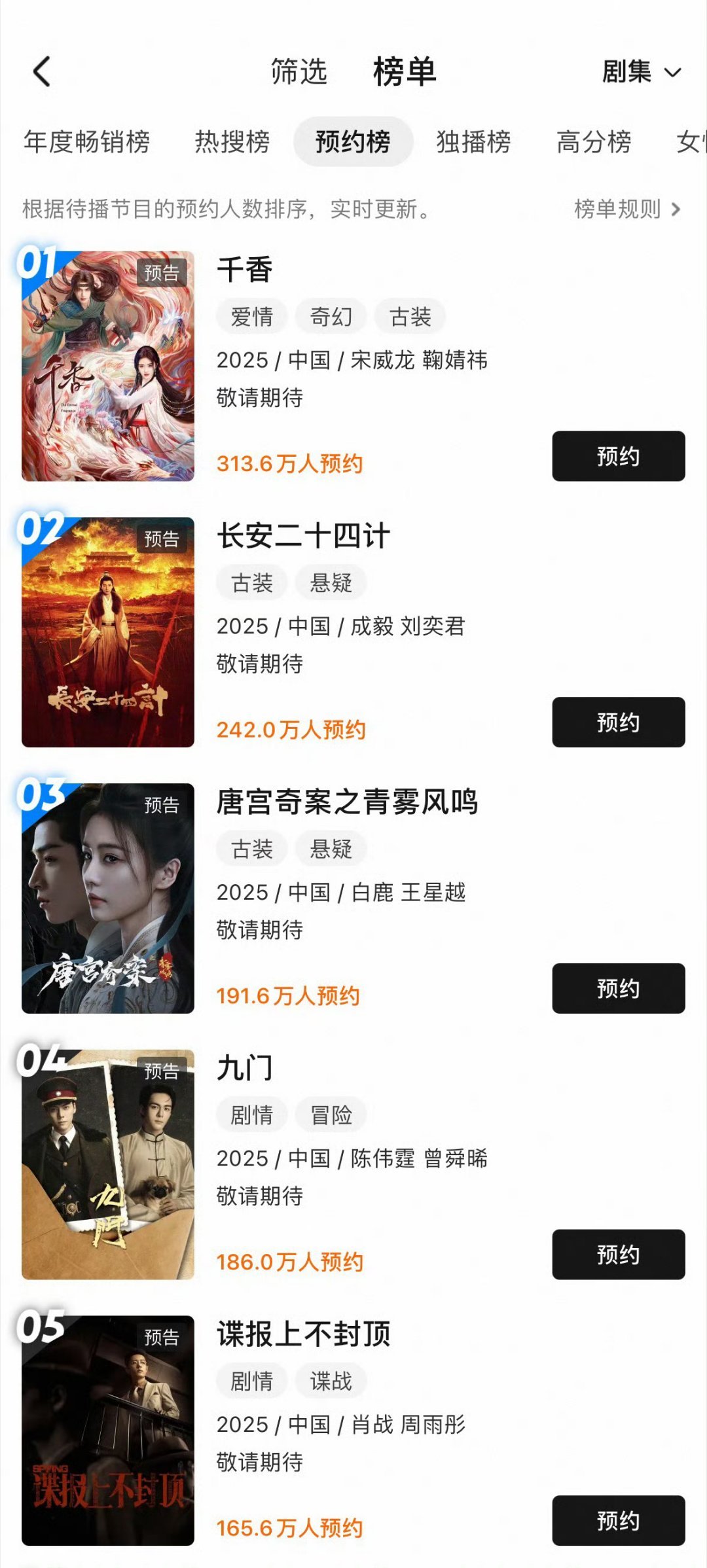 优酷预约榜前五优酷啥时候把千香抬上来,这预约量一直登顶