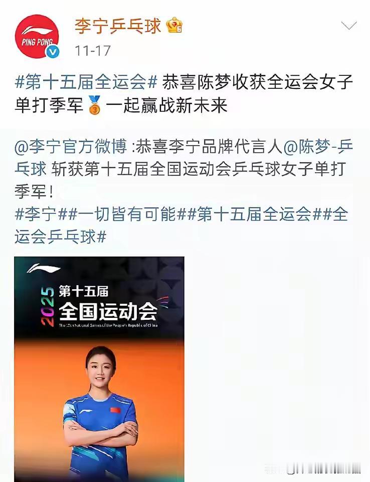 陈梦全运会之旅意想不到迎来李宁官方微博:恭喜李宁品牌代言人陈梦斩获全运会女子单打