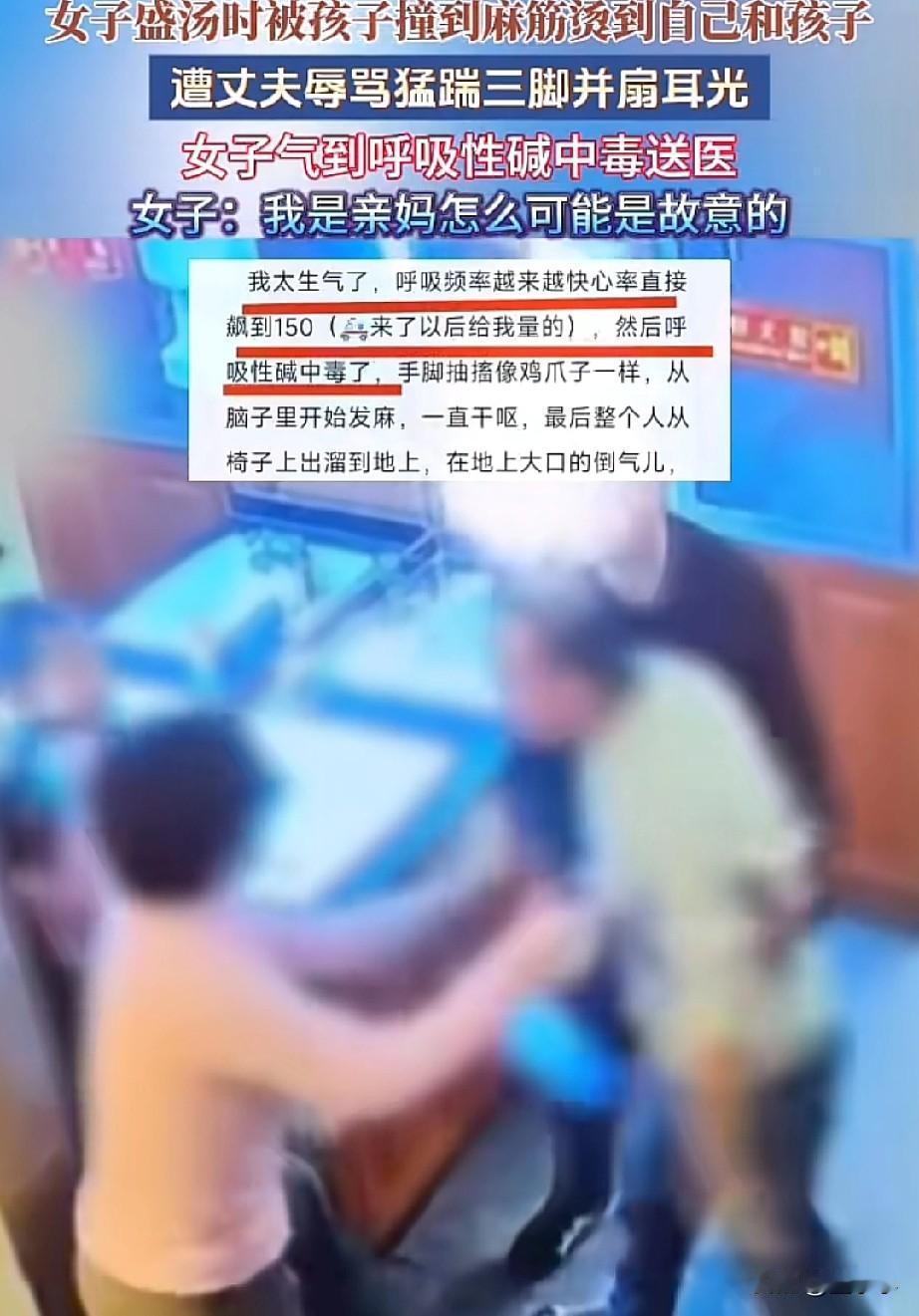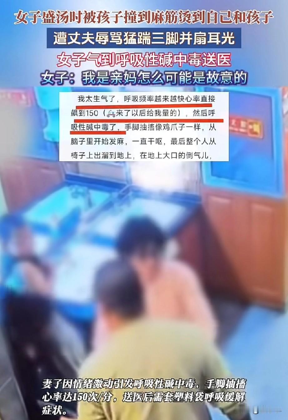 没本事的男人,把仅剩的力气放在了妻子身上!北京,一女子在盛汤时,被孩子给撞到麻筋烫到自己和孩子,却遭到了丈夫辱骂,猛踹,扇耳光,女子被气到呼吸性碱中毒送医。网友:在外面弯了一辈子的腰,终于在老婆孩子面前直起来了,这种人真恶心! 夫妻俩带着孩子在餐厅吃饭,女子在在给孩子盛汤时,孩子好动撞到了妈妈致手臂麻木,因为麻木热汤撒在了自己腿上和孩子的肩上。 本以为能得到丈夫的关怀,却不料丈夫觉得她就是故意的,不仅对她进行了辱骂,猛踹,还对自己扇耳光,好在被周围的人给制止了,要不然自己不知道会被打成什么。 因为女子太生气了,导致了呼吸性碱中毒,好在救护车及时赶到,进行了抢救。 此事引发了热议!有的网友表示,我儿子给我老婆带的时候,不小心头上整个大包,我看了一眼都气笑了,根本没心情发脾气,要说心疼吧,作为他的妈妈,我老婆肯定更自责和心疼。 是呀,作为孩子的妈妈,她也不是故意的,发生这种事情,她自己都很自责,都会怪自己导致了孩子受伤,作为丈夫还对她这样,真的太寒心了。 有的网友表示,在外面打自己老婆,指责自己老婆,它心里一定觉得自己很厉害,毕竟在外人面前一直弯着的腰突然就直了,呸!恶心玩意! 说句不好听的,在外面都能这样,不知道在家里没人知道的情况下又是怎么样的?