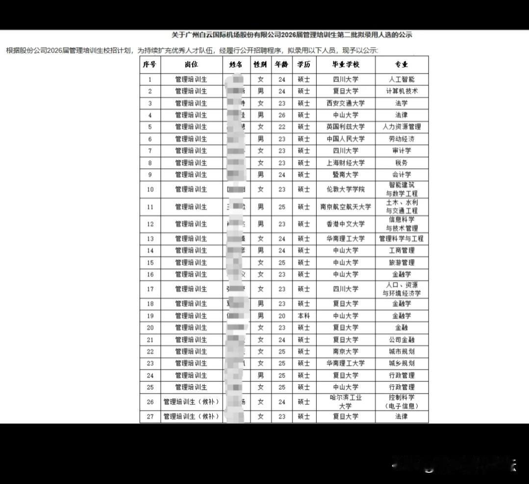 太卷了,现在真的行行都是清北毕业生!看看这份白云机场26年管培生名单。就真不能怪现在送外卖送快递都是年轻面孔吧,不能怪年轻人去卷社区工作吧。