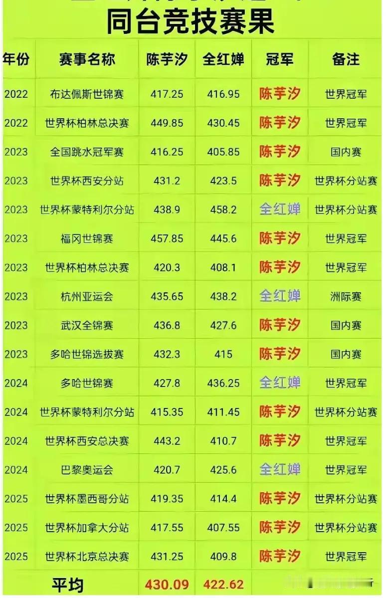 中国跳水队历史人物应该是,陈肖霞,周继红,高敏,伏明霞,郭晶晶,吴敏霞,陈若琳,陈芋汐。除陈芋汐,全红婵外,几个前辈,相互间的水平,不存在谁高谁低的问题,各自统领一个时代。陈芋汐,全红婵则不同,2019年,陈芋汐在光州世锦赛,以439分夺回失去六年的世锦赛冠军,然而是三连冠,四冠,双人跳四连冠,世界杯四连冠,双人跳四连冠。创造世锦赛,世界杯历史,成为世界第一人。而全红婵,则吃了奥运会晚一年举行的红利,横空出世,连夺二届奥运会冠军,陈芋汐,全红婵,从专业角度来看,世界杯,世锦赛,奥运会三大赛事,世界杯,世锦赛,是世界泳联举办的技术水平最高的专业性比赛,奥运会,则是综合性世界大赛,影响力巨大,同时,由于奥运会代表的是一个国家的整体体育水平,所以,中国较重视奥运会。从1984年到2024年,中国跳水队的代表人物是,周继红,陈若琳,陈芋汐,这是不可否认的,并不是说,你跳出466.20分,就代表你水平最高,要知道,跳水项目,是人工打分的,存在不确定性,按照2025年的技术标准,也就398分。//@随性自由的星球YOJ:跳板项目郭晶晶伏明霞前二吴敏霞第三[大笑]陈若琳是把跳台冠军抢回来的第一人,不到抢回来了整个生涯还霸榜,地位可想而知[捂脸]