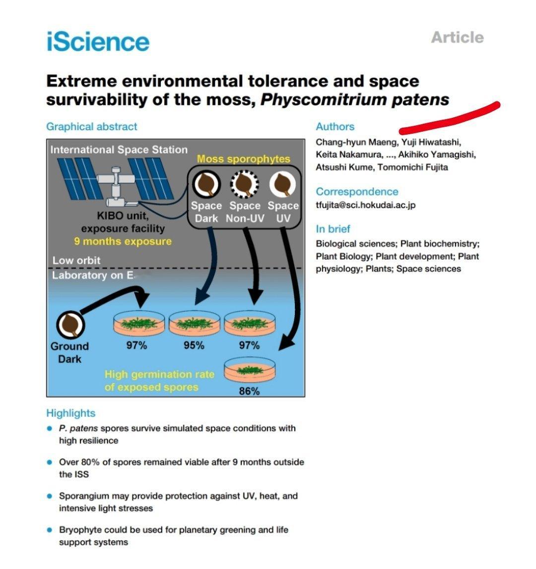 日本科学家刚发的太空实验:苔藓的孢子在外太空经历了长达283天的暴露!返回地球大部分可以活着!¹ 真空、超低温、超强辐射,在“虚无”的太空环境283天!但86%的苔藓孢子依然活下来。跟着SpaceX飞船返回地球后,萌发了(当然萌发率低于地面对照组,86%vs96%),生命得到延续。² 分析认为跟孢子囊的强大保护作用有关。孢子囊就像是苔藓孢子的天然“飞船”,很多年前保护它们登上陆地,繁衍生息。很多年后说不定保护它们登上火星、月球基地,然后把沙化层变成肥沃的土壤,同时生产氧气。