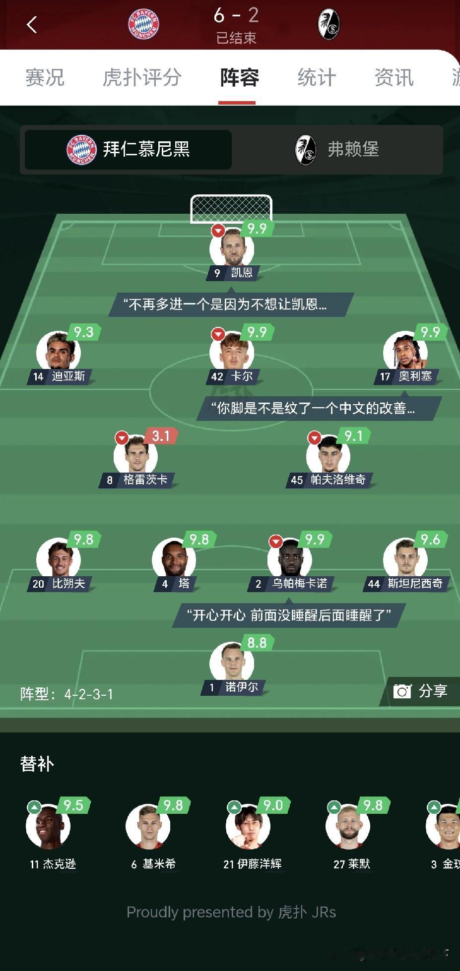 弗赖堡啊弗赖堡,你没事儿惹南大王那个混蛋干什么?遇到拜仁先进球,还进俩,那不完了吗。 拜仁:你们都看见了,是弗莱堡先动手的,那就别赖我不给面子了。这已经不是一般的弗莱堡了,必须要出重拳。 看到20分钟弗莱堡2-0我非但不担心拜仁,甚至还有些担心弗莱堡后面这70分钟得怎么才能挺得住。连丢两球被打醒之后拜仁完全压着弗莱堡打,在前场随意的带球、穿插。这状态,忒吓人了。 感觉这支拜仁有点2013年的感觉了,落后不慌,替补更猛。 还有这奥利塞歇了十天时间状态明显起来了,这场绝对会是奥利塞生涯代表作了。阿森纳颤抖吧!