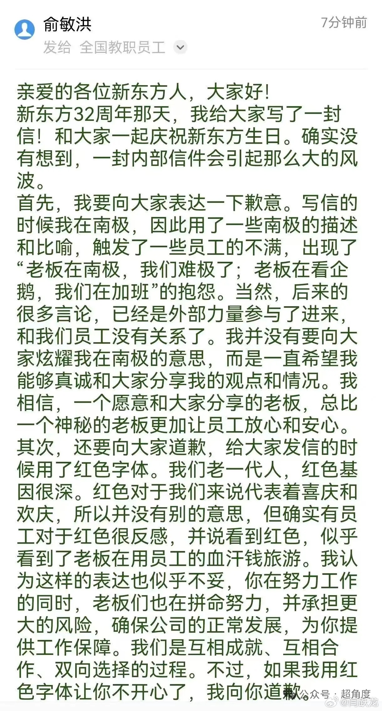 俞敏洪深夜再写全员信,用了绿色字体,向员工道歉,感觉很真诚。逼的没做错什么的老板这样放低姿态,不停道歉,真是无语😅