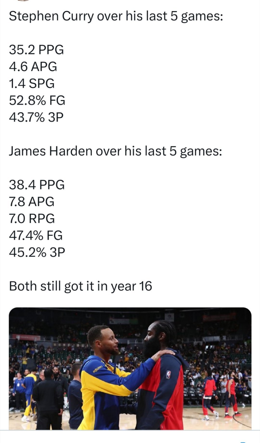 ▲库里过去5场比赛,场均35.2分+4.6助攻+1.4抢断,命中率52.8%,三分球命中率43.7%▲哈登过去5场比赛,场均38.4分+7.8助攻+7篮板,命中率47.4%,三分球命中率45.2%
