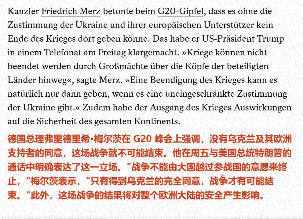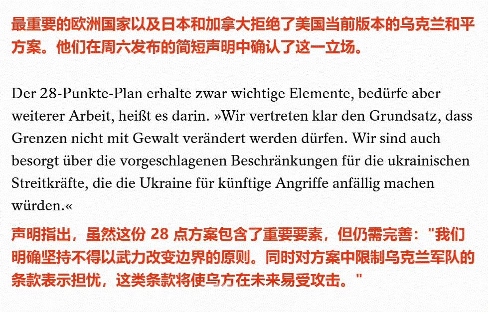 目前欧洲是强烈反对28条,因为28条不仅意味着“乌克兰丧权辱国”,同时也意味着欧洲“丧权辱国”;加拿大反对其实也能理解,加拿大和美国今年以来龌龊越来越大,反对美国已经成为加拿大的政治正确;日本也反对,开始我是想不明白的,但把近期中日冲突连贯起来一看,就会想通了。日本担心自己被中国揍了的话,会被美国拉偏架,到时候就真的只有本州四岛,其他的都划走了。但这28条要签,应该还有很长的路要走,这28条本来就是摔出来转移美国近期其他国内矛盾的,比如共和党内讧,比如公布爱泼斯坦文件等。 另外,俄乌冲突把欧洲人真打穷了,冯大妈身上这件克莱因蓝西装,已经穿了好几天。