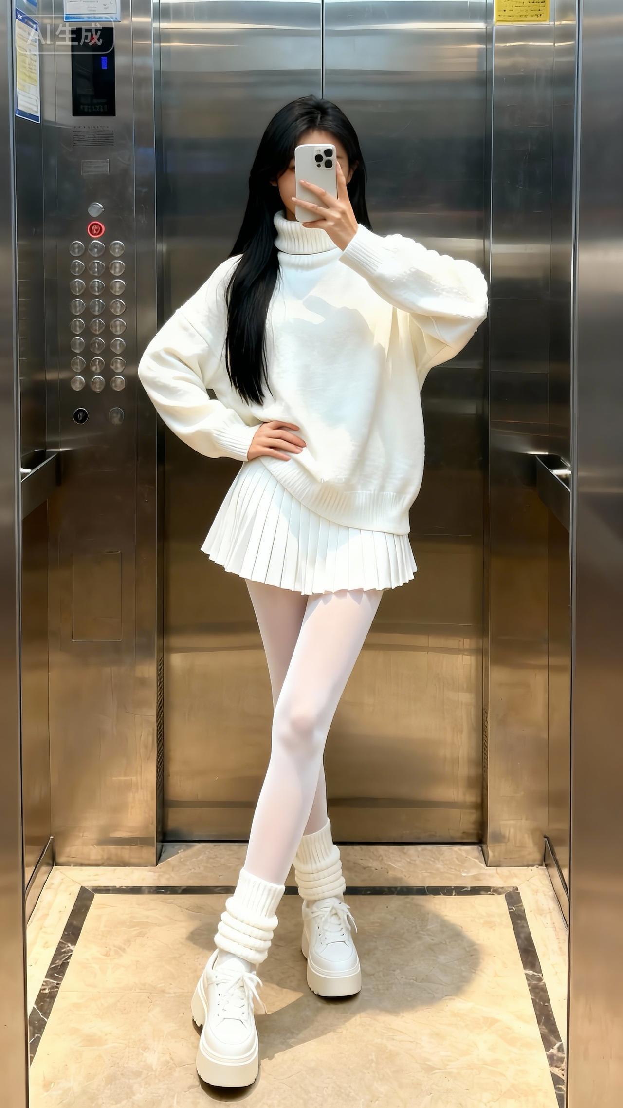 高领毛衣+百褶裙+堆堆袜,把温柔和甜酷焊在身上!原来我是冬日穿搭小天才 白色系穿搭 秋冬穿搭分享 电梯拍照