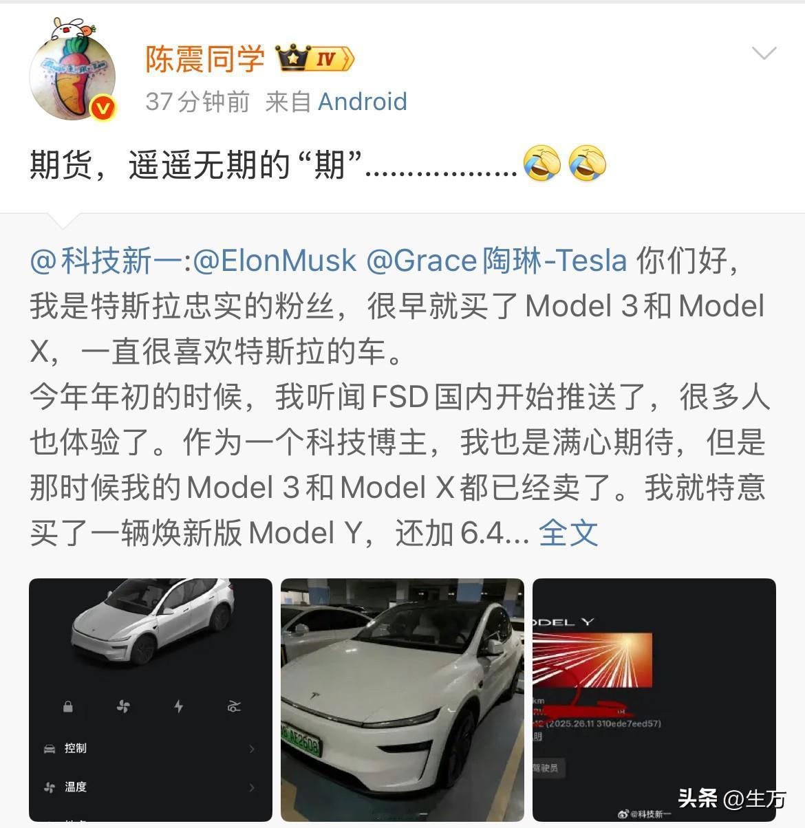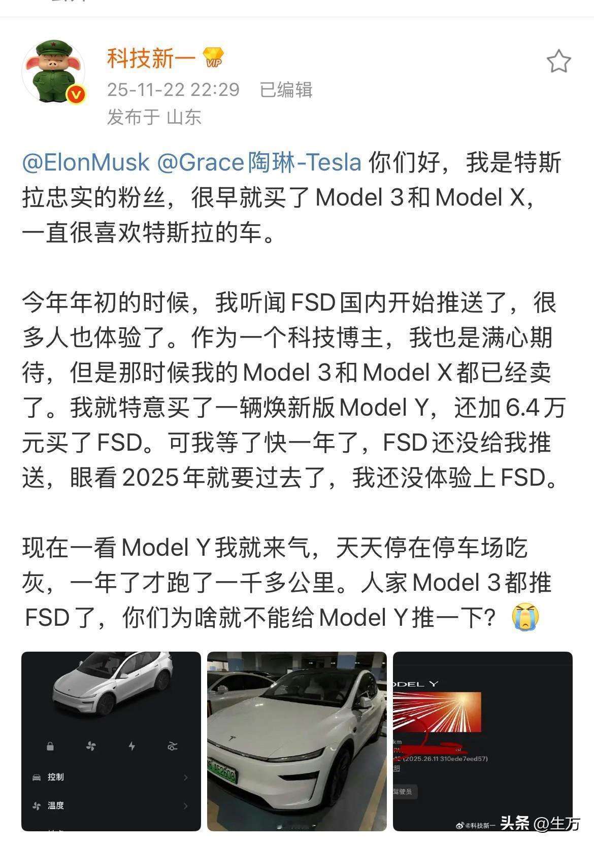 陈震评国内特斯拉用户想要用FSD:遥遥无期! 就在刚才,有博主专门问候了马斯克和中国特斯拉的负责人,他向这两位全球负责人和中国负责人说明了他的情况: 他是真正早期的特斯拉用户,因为在多年之前他就购买了很早就买了Model 3和Model X,而且只要特斯拉出新车,他就会买,包括现在购买的特斯拉Model Y 。 他也和许多购买了这辆车的用户一样,花了六万多块钱,买了特斯拉的辅助驾驶系统安装包,鉴定完头盔要钱,他已经交了一年多了,天天都在盼望者,特斯拉官方能够给他推送正式版本的FSD。 可是从去年交的钱到现在,已经整整过去一年了,马上2025年也要结束了,可是他的特斯拉Model Y到现在一直都没有更新FSD,所以他就把这个车,一直放在停车场里面吃灰,也就是说,现在这辆车已经吃了一年多的灰了[捂脸] 不过还好,他是一个几百万的大博主,所以他高低在网上还是有一点点话语权,因此他也只有通过这种方式,来向这些负责人喊话,看看他们会不会有回应[捂脸] 陈震看到这位博主的诉求之后,打趣的时候说,他买的是一个期货,而且是遥遥无期的那种期货[捂脸] 因为各种各样的原因,特斯拉FSD完整版本,估计在短时间内,还没办法在我们这边完全落地,所以看样子,不仅仅是这位博主,同样是买了这批车的车主们,估计还在等上一段时间。