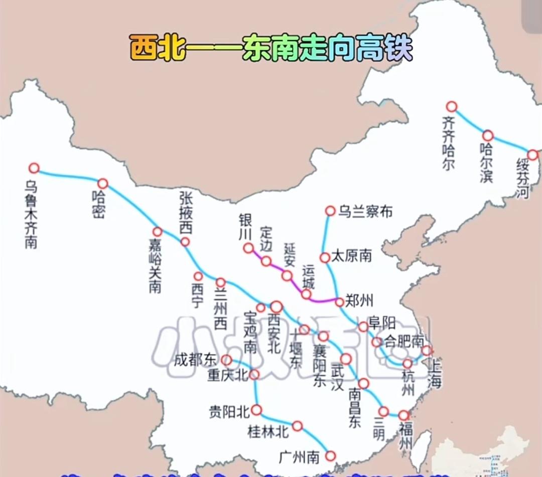 在西北-东南高铁走向中,福州至乌鲁木齐是最长的一条,也是一天战略通道,而其中沪银通道的郑州至银川段也是一天干线,其重要性也是不言而喻,只是目前这条高铁还存在于规划中,而且还有西安的备用线路,而成都至广州的高铁通道可以延伸到深圳/香港,以及成都到格尔木铁路,齐齐哈尔可以延伸到满洲里,这些都是国家级的战略级高铁通道。