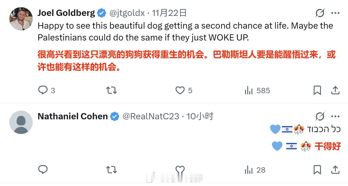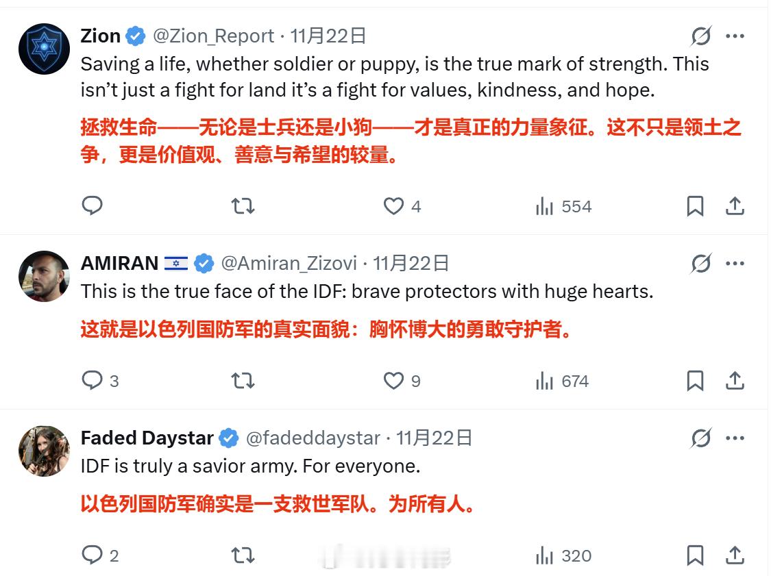 加沙那边这几天杀得血流成河,以色列帐号却在网上庆祝以军在加沙救了一只小狗,评论区的畜生们是真TM能说啊