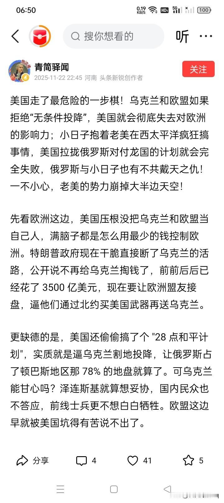 弄巧成拙! 刚刚出台的所谓乌克兰28条和平草案,估计引起了全世界的一片哗然。虽然表面看乌克兰正在领土和主权完整方面承受着巨大的压力和威胁,但估计筹划出这个28条和平草案的人,也不会趾高气扬,洋洋得意,大概也很可能要承受来自四面八方的压力,特别是来自本国公众选民的压力。 正如网络上有消息说的,美国前国务卿希拉里好像表示:他们要求乌克兰向大鹅投降的最后通牒,会助他们获得张伯伦奖,以表彰他们背叛和平、自由和正义。 另外,由于这个28和平草案,好像严重不符合乌克兰和乌克兰欧洲伙伴囯的态度和立场,引起了他们的不满、甚至是强烈的不满,并且可能进一步怀疑诞生这个28条和平草案背后的动机。 欧盟理事会、欧盟委员会和欧洲多个主要国家虽然提出了以28条协议草案为基础进行协商和修改,估计也不过好像是改头换面的、委惋的拒绝,因为未来可能的协商才是真正的关键。 据网络上有消息说,乌克兰总统泽连斯基似乎已经作出了拒绝28条和平草案的表示。如果泽连斯基真的是拒绝了上述和平草案,大概就说明这个草案已经胎死腹中。但结果估计却是让很多的人,进一步看清了自私自利,唯利是图,以及不可一世,妄自尊大的嘴脸,与此同时,也只能是以弄巧成拙画上句号。