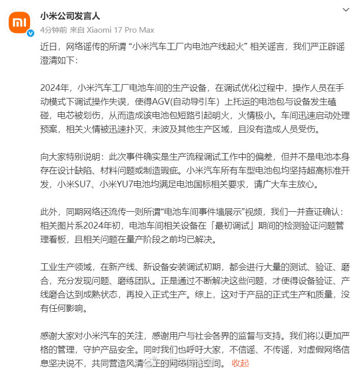 11月23日, 发文辟谣小米汽车工厂内电池产线起火。近日,网络谣传的所谓 “小米汽车工厂内电池产线起火” 相关谣言,我们严正辟谣澄清如下:2024年,小米汽车工厂电池车间的生产设备,在调试优化过程中,操作人员在手动模式下调试操作失误,使得AGV(自动导引车)上托运的电池包与设备发生磕碰,电芯被划伤,从而造成该电池包短路引起明火,火情极小。车间迅速启动处理预案,相关火情被迅速扑灭,未波及其他生产区域,且没有造成人员受伤。向大家特别说明:此次事件确实是生产流程调试工作中的偏差,但并不是电池本身存在设计缺陷、材料问题或制造瑕疵。小米汽车所有车型电池包均坚持超高标准开发,小米SU7、小米YU7电池均满足电池国标相关要求,请广大车主放心。此外,同期网络还流传一则所谓“电池车间事件墙展示”视频,我们一并查证确认:相关图片系2024年初,电池车间相关设备在「最初调试」期间的检测验证问题管理看板,且相关问题在量产阶段之前均已解决。工业生产领域,在新产线、新设备安装调试初期,都会进行大量的测试、验证、磨合,充分发现问题、磨练团队。正是通过不断解决这些问题,才使得设备验证、产线磨合达到成熟状态,再投入正式生产。综上,这对于产品的正式生产和质量,没有任何影响。感谢大家对小米汽车的关注,感谢用户与社会各界的监督与支持。我们将以更加严格的管理,守护产品安全。同时我们也呼吁大家,不信谣、不传谣,对虚假网络信息坚决说不,共同营造风清气正的网络舆论空间。
