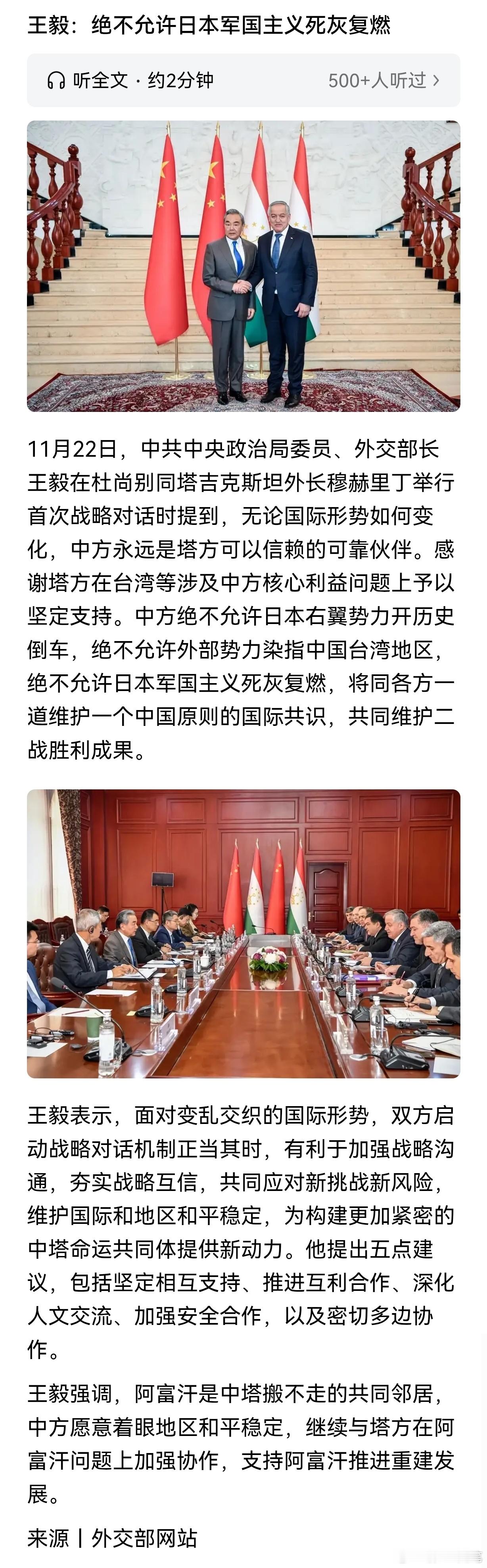 王毅:绝不允许日本军国主义死灰复燃!和塔吉克斯坦交流时候,感谢塔方在台湾等涉及中方核心利益问题上予以坚定支持。中方绝不允许日本右翼势力开历史倒车,绝不允许外部势力染指中国台湾地区,绝不允许日本军国主义死灰复燃,将同各方一道维护一个中国原则的国际共识,共同维护二战胜利成果。这是开始上强度了,把高市早苗行动定义为军国主义死灰复燃的危险。按着敌国条款的套路继续完善,做到以后我们打小日子先发制敌也理直气壮。