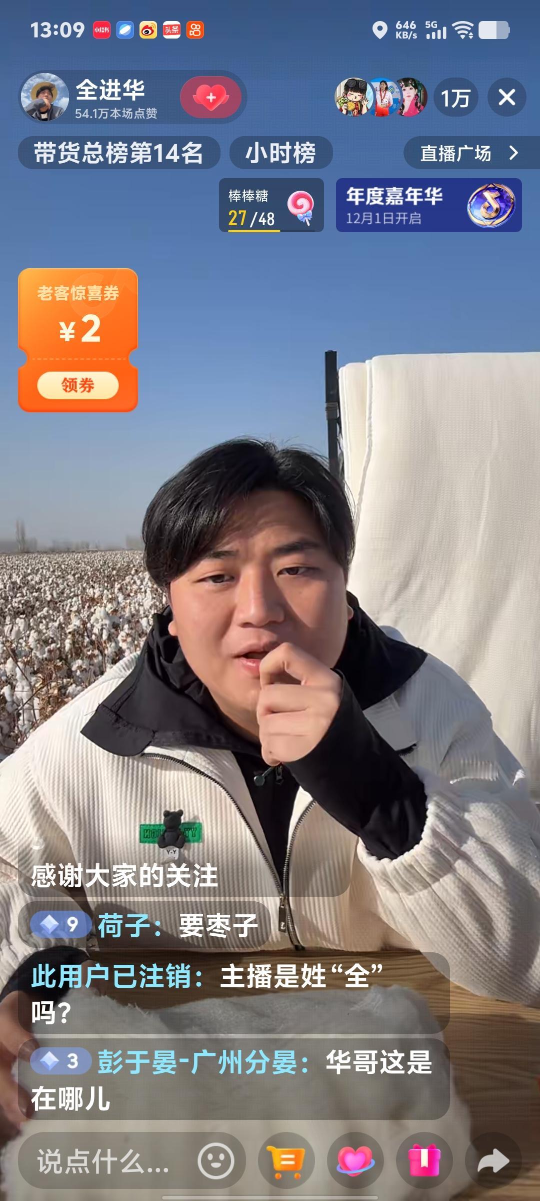 全红婵哥哥直播带货新疆特产!1万+网友疯抢,硬核回怼黑粉太圈粉~ 全红婵的哥哥全进华今天直播直播间里有1万多人卖的是新疆棉花被粉丝们积极踊跃下单。 除了棉花被,还有新疆的其他特产。腊肉,香肠,蘑菇,蓝莓,南瓜,红糖橘子,苹果,大枣 有网友问妹妹还在家呢,是不是上班了?大哥说上班了。江红婵15运会之后回家看了看爷爷奶奶。 是何威仪夫妻俩开车送回去的。师傅走了以后,婵宝就骑着心爱的小摩托,带着妹妹出去玩了。 有黑粉曾经在直播间里问哥哥,如果没有全红婵,谁认识你呀?就是在割妹妹的韭菜。 哥哥大大方方的回应。我就是全红婵的亲哥哥。你眼馋也没用。看着网友们都笑翻了。 全红婵一家靠着自己的勤劳助农带货。还带动了整个村庄的旅游业。为家乡做出了很大的贡献。 这一家人都值得尊敬。
