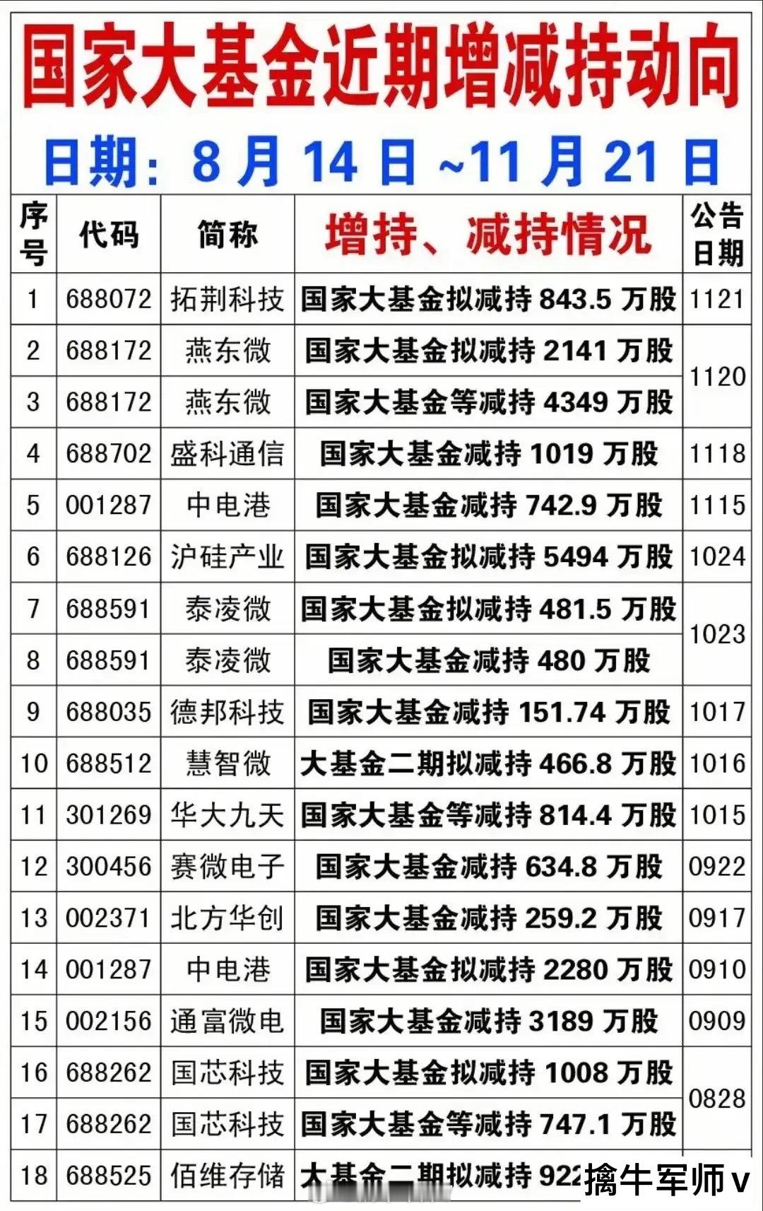 避雷,最新立案调查风险、国家队减持风险!(9月1日~11月23日立案调查公司名单整理)(1)科技龙头减仓风险:三季度数据国家队“大基金”大幅减仓这些科技龙头!中电港减持3000多万股、北方华创减持260万股、华大九天减持800万股……(2)近三个月立案调查风险:被立案调查的非ST公司有海南华铁、上海洗霸、路桥信息、白银有色等等。立案调查潜在高风险,不得不防! 理财有风险投资需谨慎!