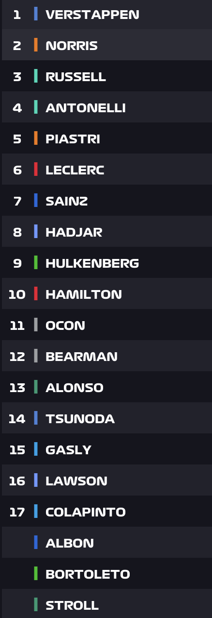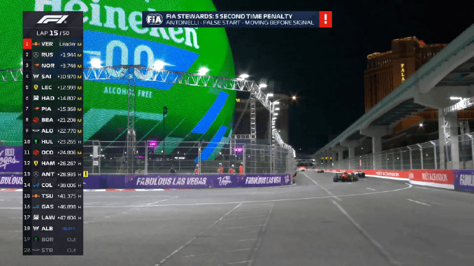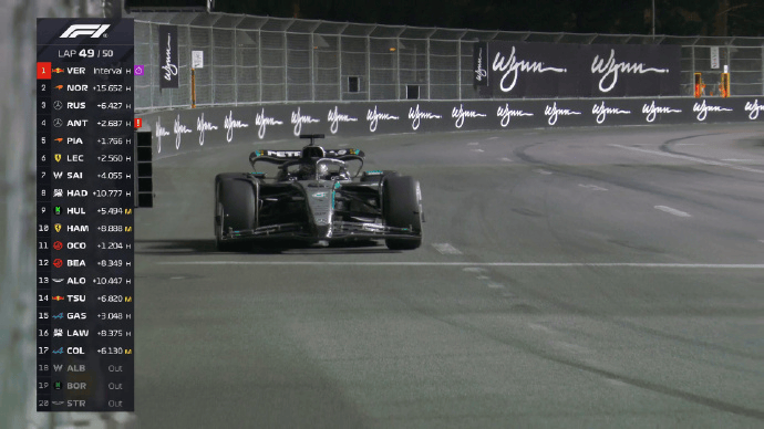 虎扑11月23日讯在刚刚结束的F1拉斯维加斯正赛中,维斯塔潘在发车阶段上到第一并最终夺冠,诺里斯排名第二继续排名车手积分榜榜首,拉塞尔排在第三,皮亚斯特里拿到第四,安东内利因为发车罚时排在第五,勒克莱尔排在第六,排名7-10位的分别是塞恩斯、哈贾尔、霍肯伯格和汉密尔顿;博托莱托和斯托尔因发车阶段事故退赛,阿尔本同样退赛。