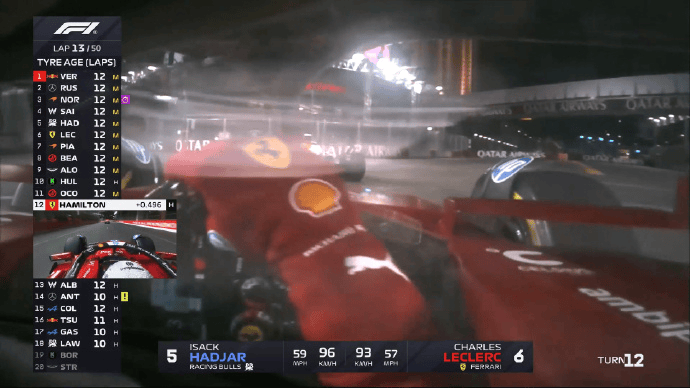 勒克莱尔超越皮亚斯特里上到P6,汉密尔顿已经上升7个位置来到P12;