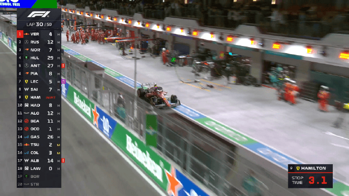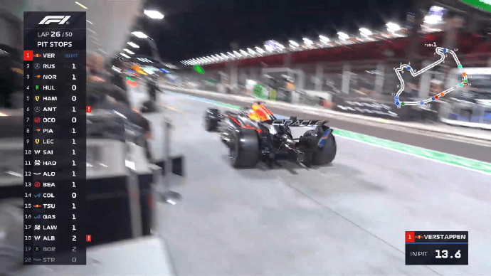 维斯塔潘进站稍慢,出站后继续领跑比赛;