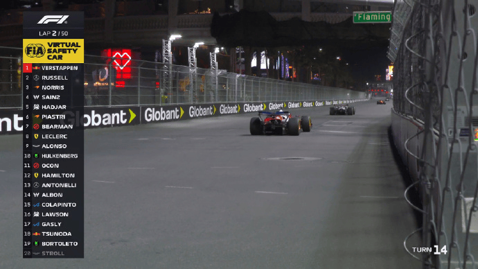 劳森因1号弯与皮亚斯特里的碰撞前翼受损,VSC出动;