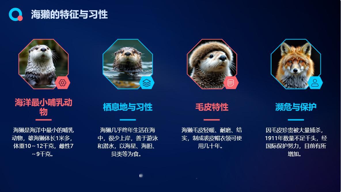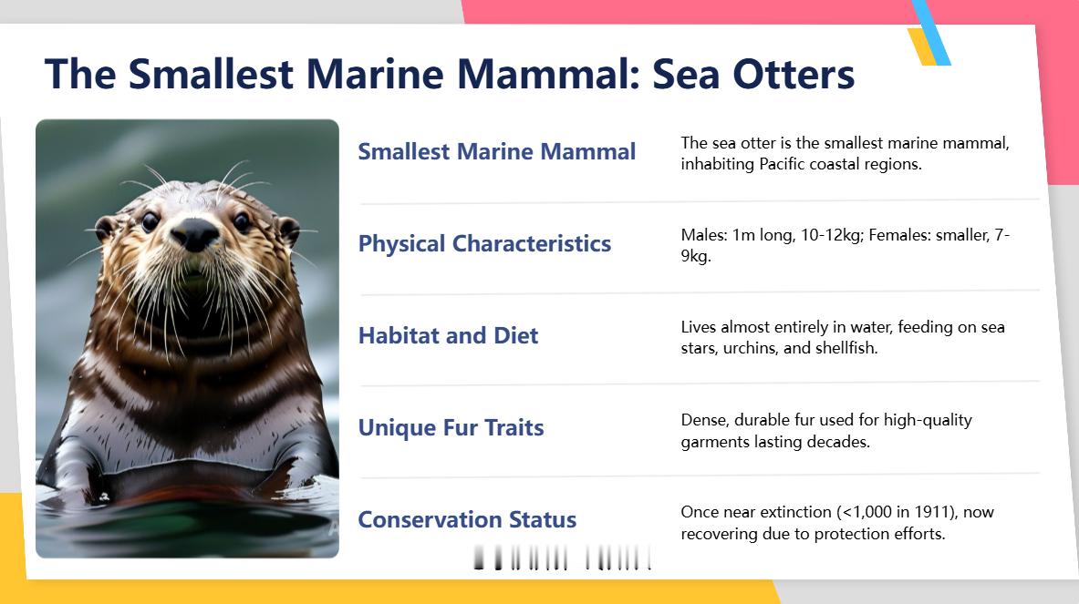 海洋中最小的哺乳动物如果说蓝鲸是海洋中最大的哺乳动物,那么,海洋中最小的哺乳动物是什么呢?答案是生活在从太平洋的千岛群岛到北美洲西海岸海域的海獭。雄海獭有1米多长,尾巴长30厘米,体重10~12千克;雌性比雄性小一些,只有7~9千克。它不但善于游泳,而且能潜入海底,以海星、海胆、贝类、海参等为食。海獭几乎终年生活在海中,很少上岸活动。海獭的毛皮轻暖、耐磨、结实,如制成裘皮帽衣领,使用几十年也不会坏掉。正因如此,海獭被大量捕杀,到1911年时,数量已不足千头,经过国际动物保护协会的不懈努力,目前已增加了一些。||